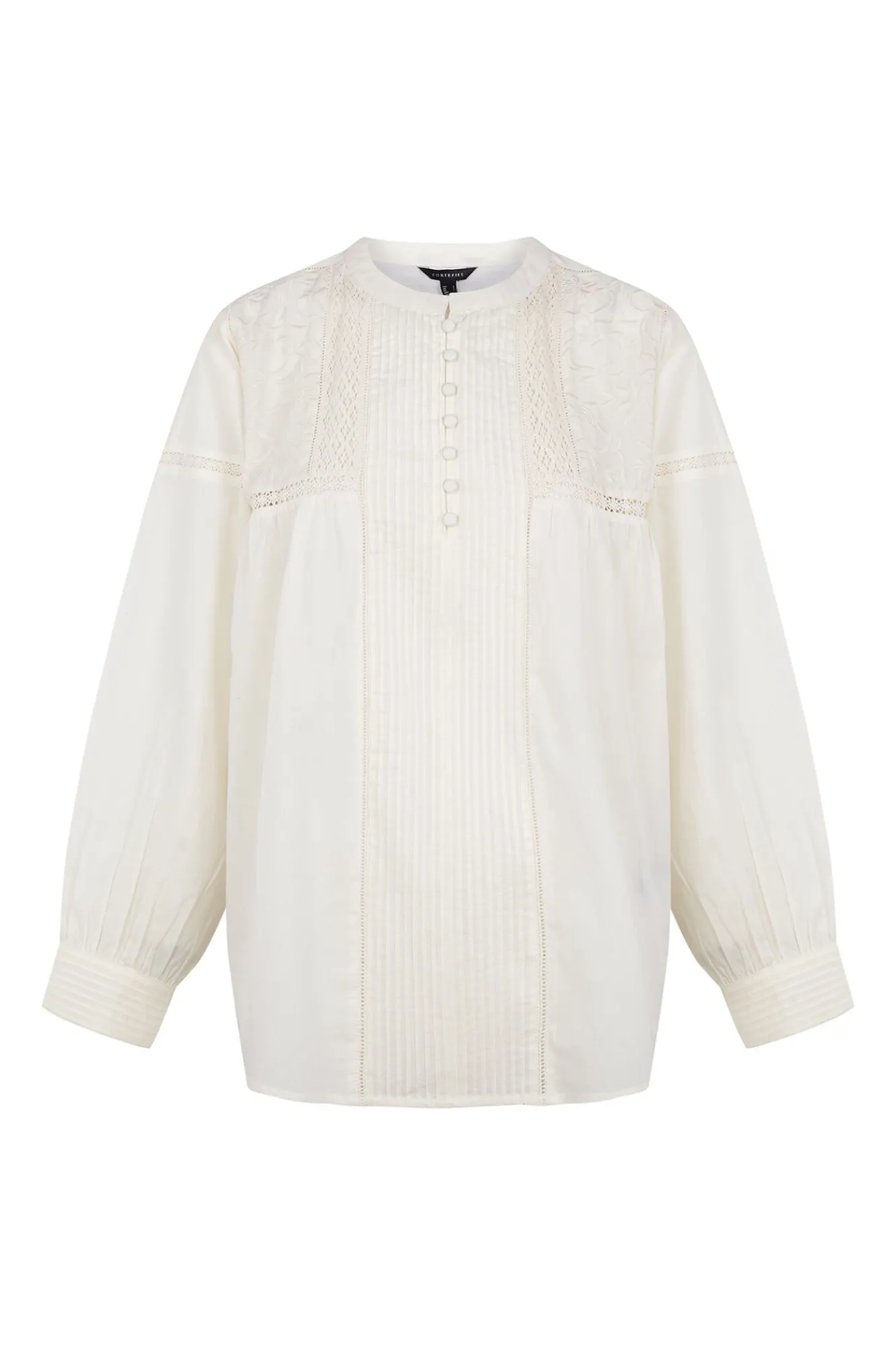 – Detalle de bordados, encaje y tablas en el delanteros.