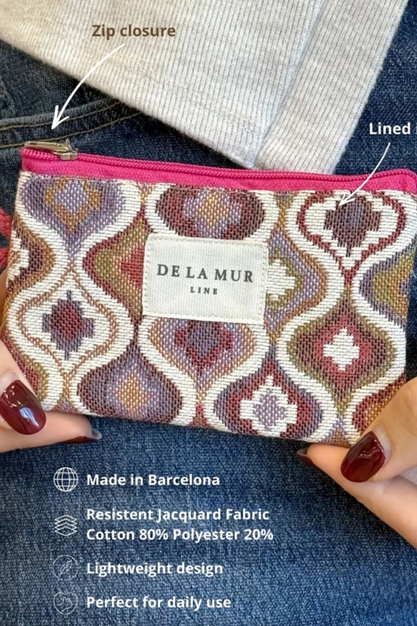 Monedero con cremallera en la parte superior y pequeña asa de cordón de color rosa en el lateral. Con tejido grueso de jacquard 80% algodón y 20% poliéster con estampado geométrico en tonos rosados y lilas. Cada articulo puede tener una variación en el estampado, dependiendo de donde se haya efectuado el corte de la pieza. Forrado de tejido grueso de color gris en la parte interior. Para su correcto mantenimiento se aconseja lavarlo en frío y no utilizar secadora.