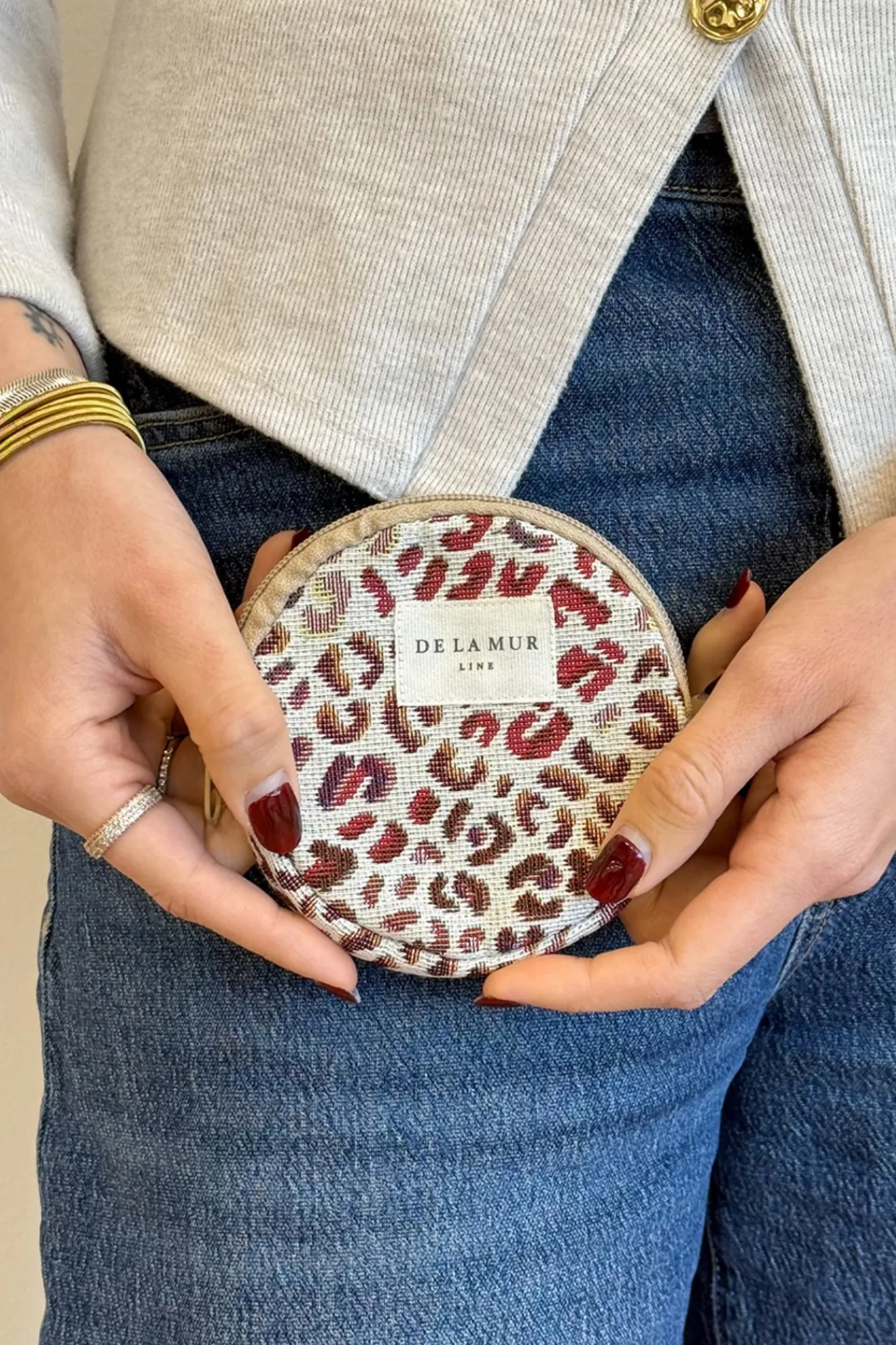 Monedero redondo con cremallera en la parte superior. Con tejido grueso de jacquard 80% algodón y 20% poliéster con estampado de leopardo en tonos rosados y lilas. Cada articulo puede tener una variación en el estampado, dependiendo de donde se haya efectuado el corte de la pieza. Forrado de tejido grueso de color gris en la parte interior. Para su correcto mantenimiento se aconseja lavarlo en frío y no utilizar secadora.