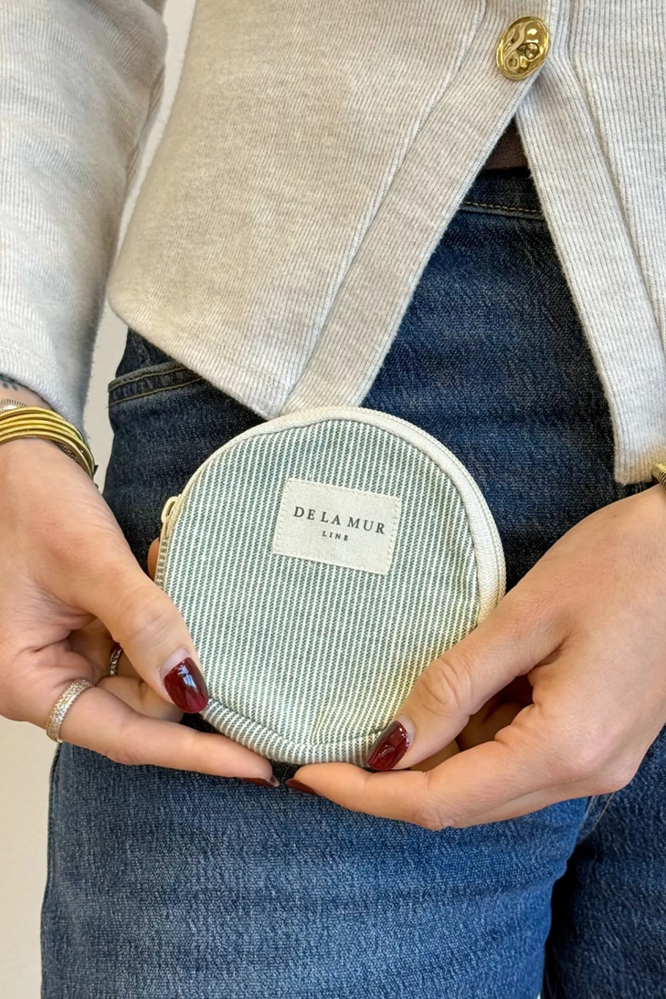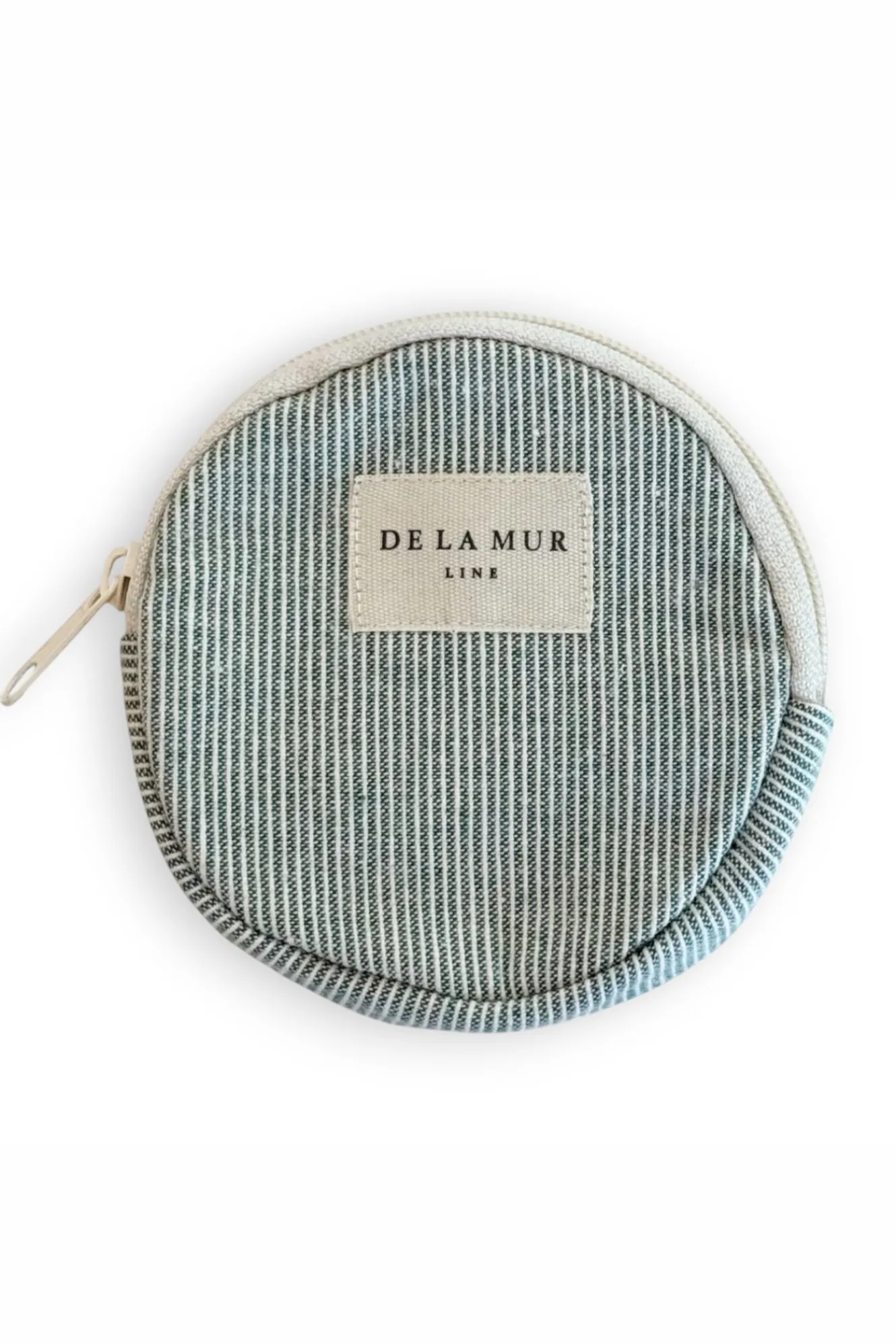 Monedero redondo con cremallera en la parte superior. Con tejido fino con relieve 80% algodón y 20% poliéster con estampado a rayas en tono verde clarito. Cada articulo puede tener una variación en el estampado, dependiendo de donde se haya efectuado el corte de la pieza. Forrado de tejido grueso de color gris en la parte interior. Para su correcto mantenimiento se aconseja lavarlo en frío y no utilizar secadora.