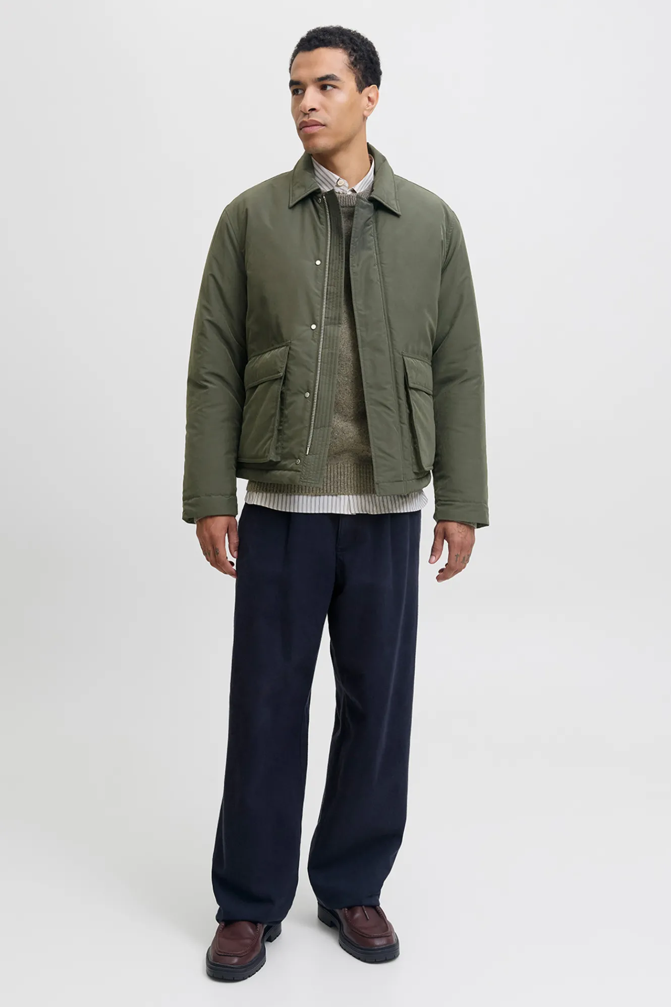 – Cuenta con cuello clásico, mangas largas y cierre frontal con cremallera y botones
