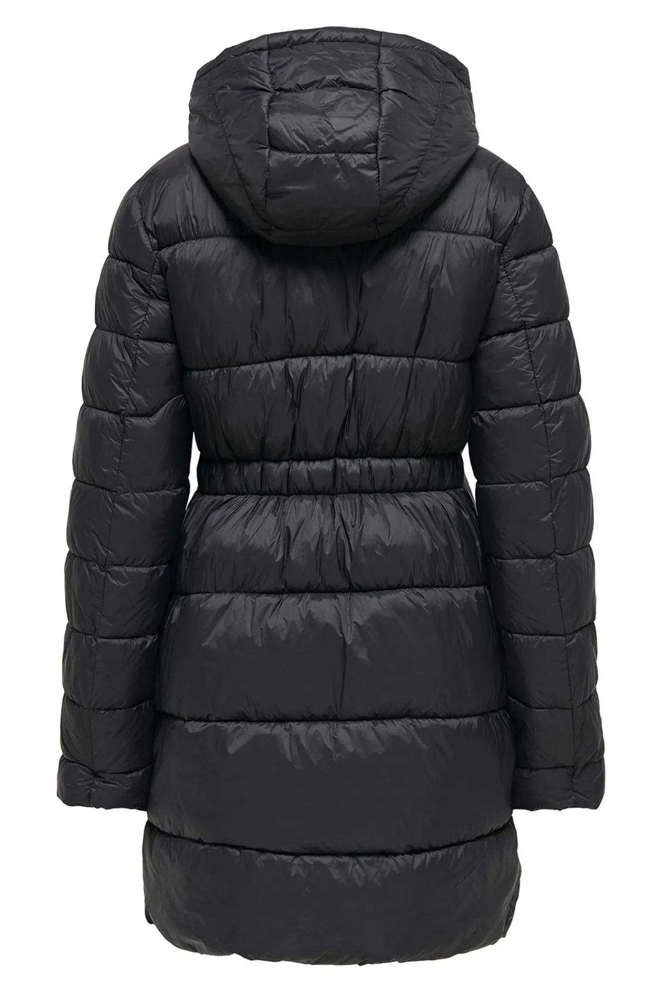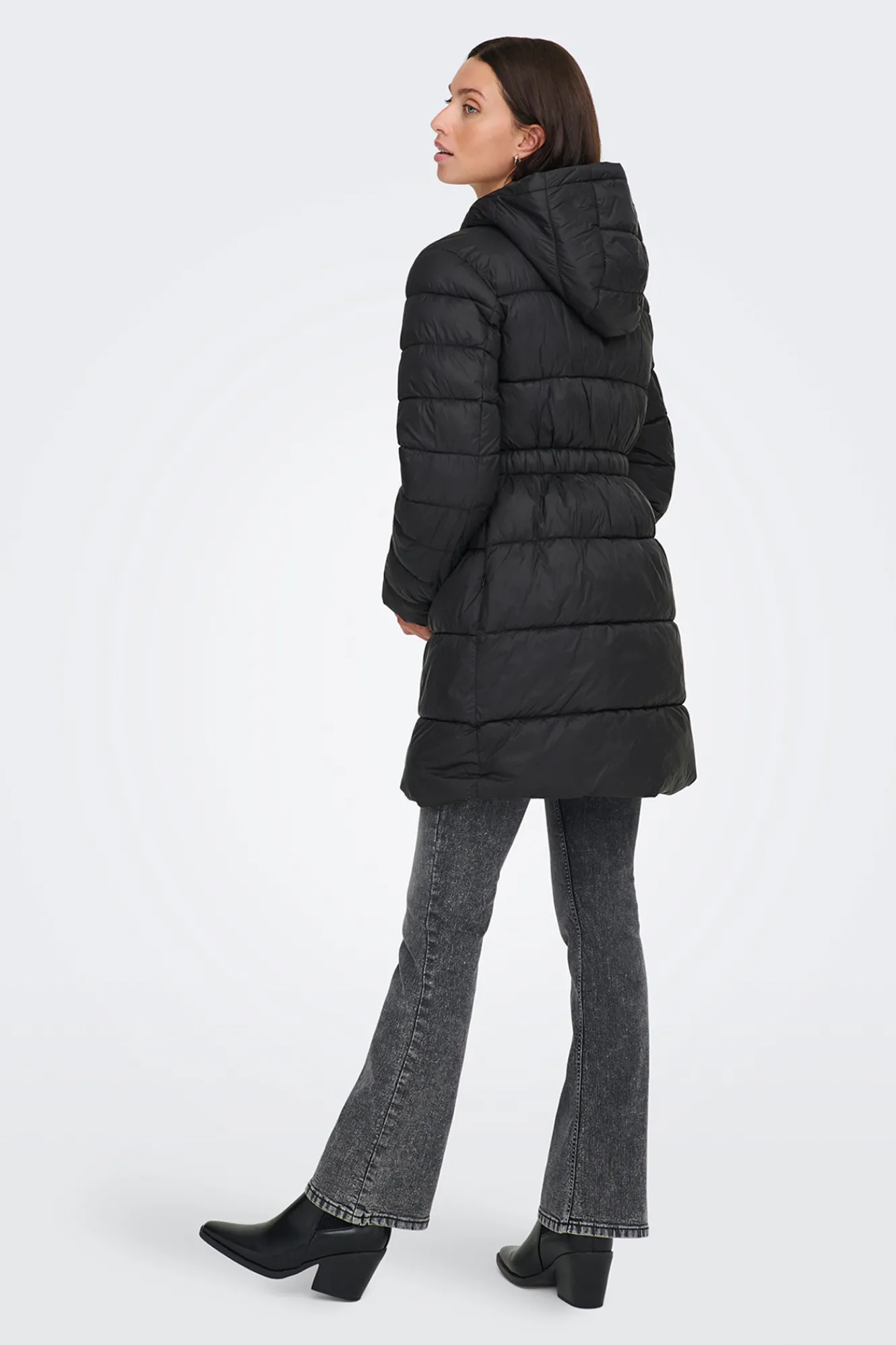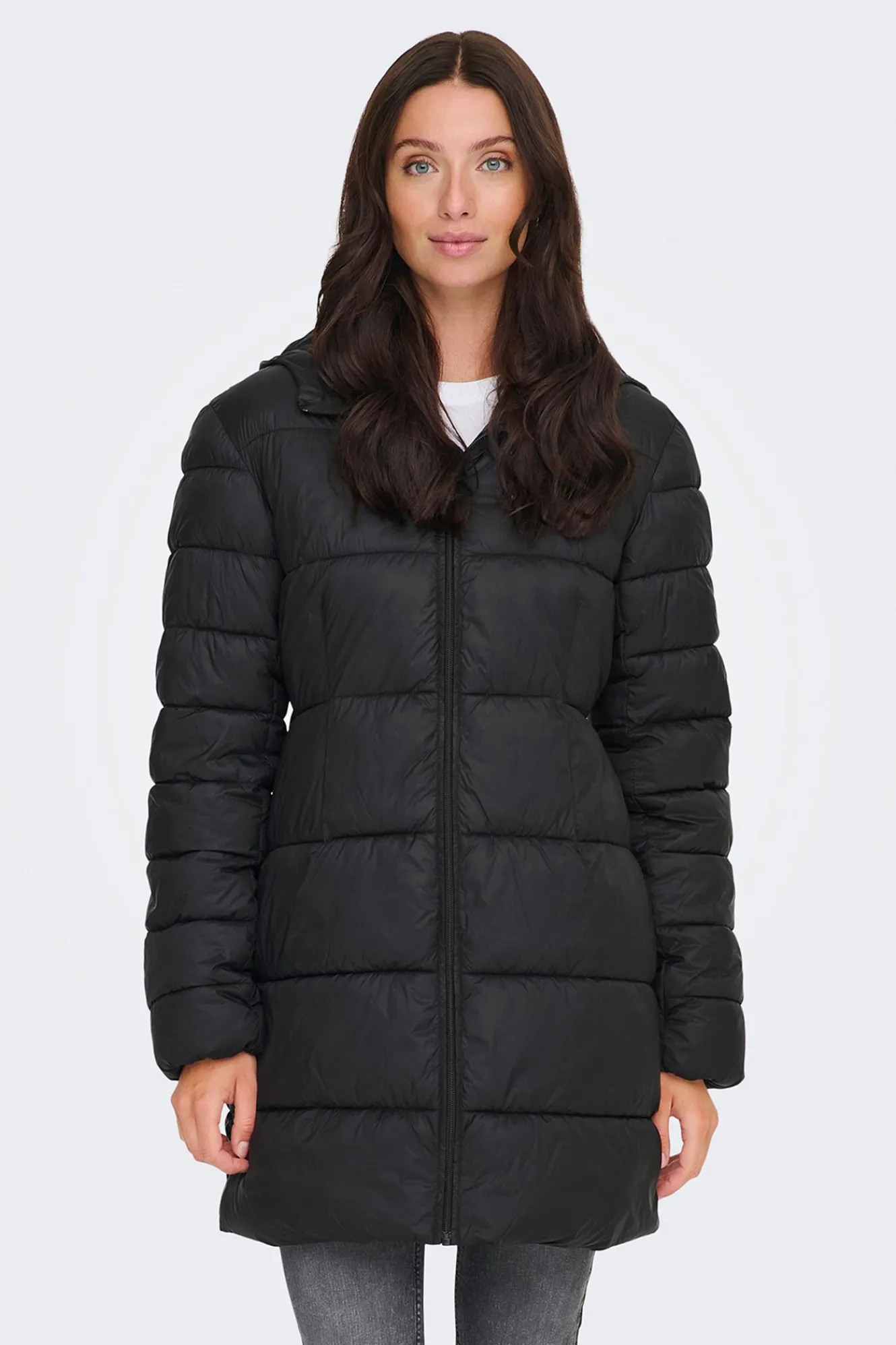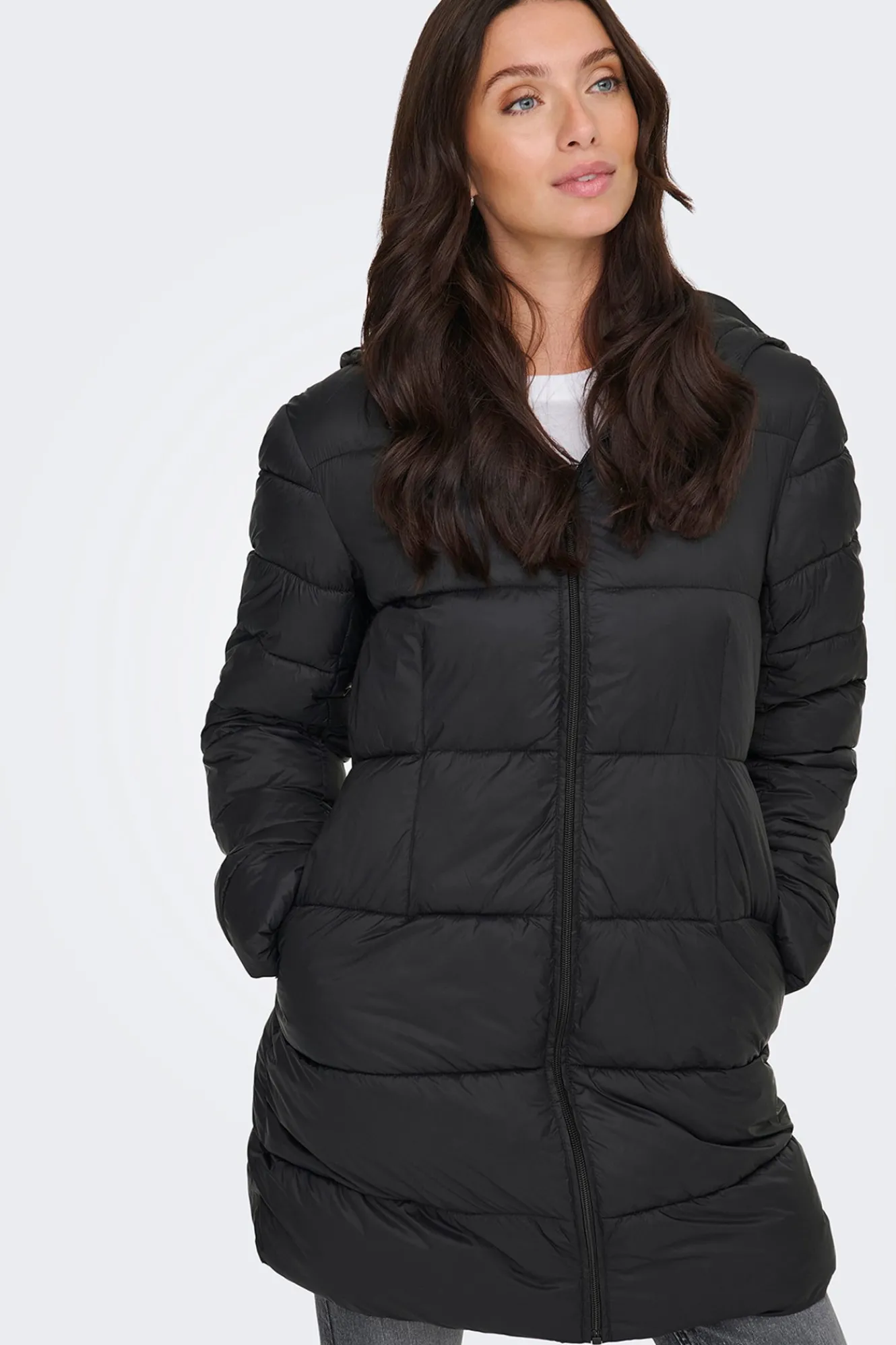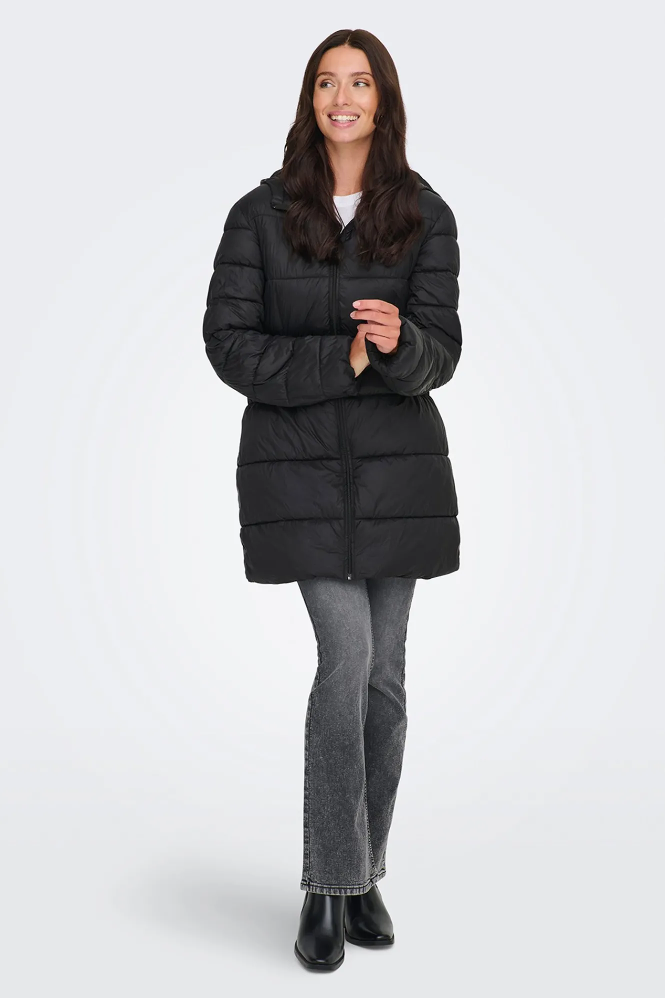 – Corte recto, cuello alto con chapucha, cintura ajustada con elástico, cierre de cremallera frontal y bolsillos laterales.