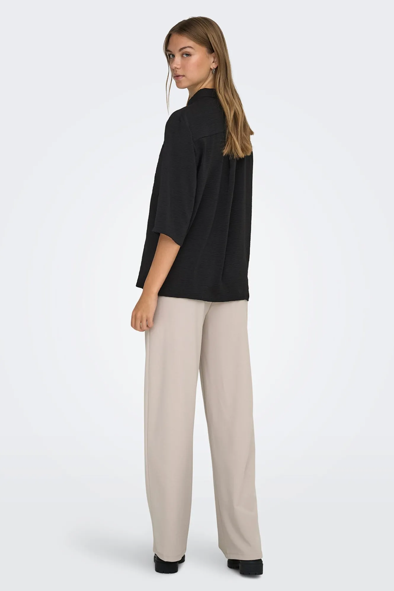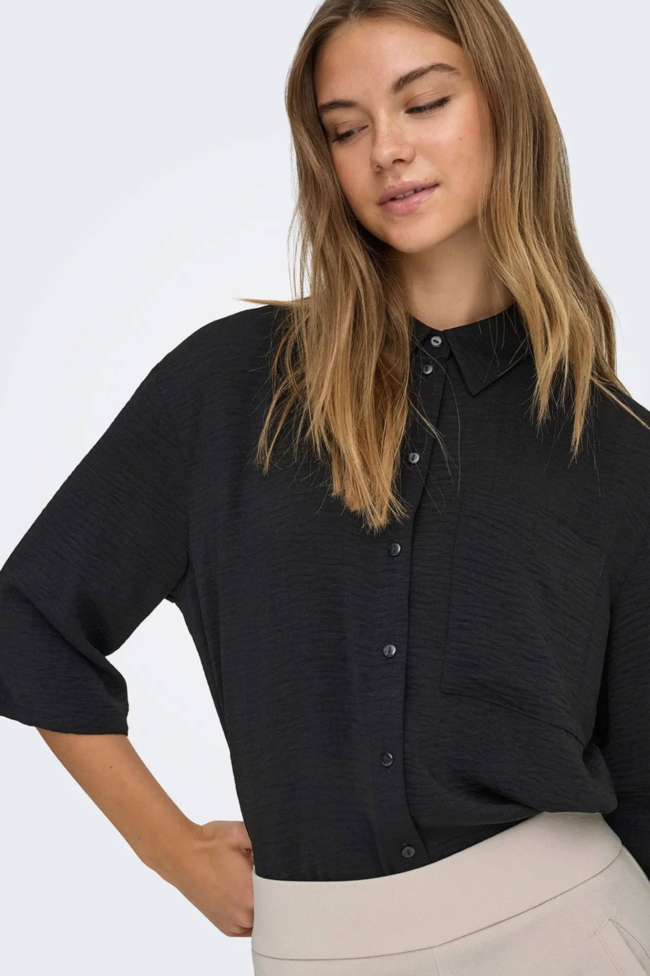 – Cuello clásico, cierre de botones delantero y bolsillo frontal superior.