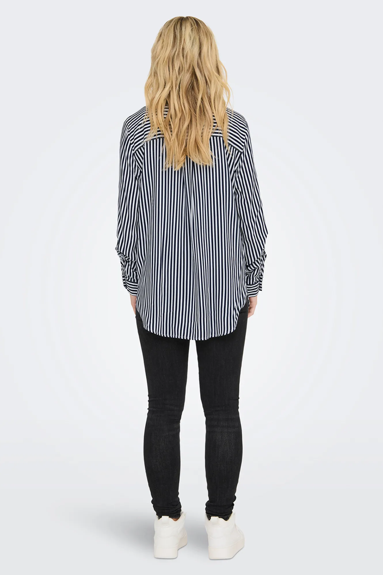 – Cuello clásico, manga ajustable con botón, cierre de botones delantero y bajo asimétrico.