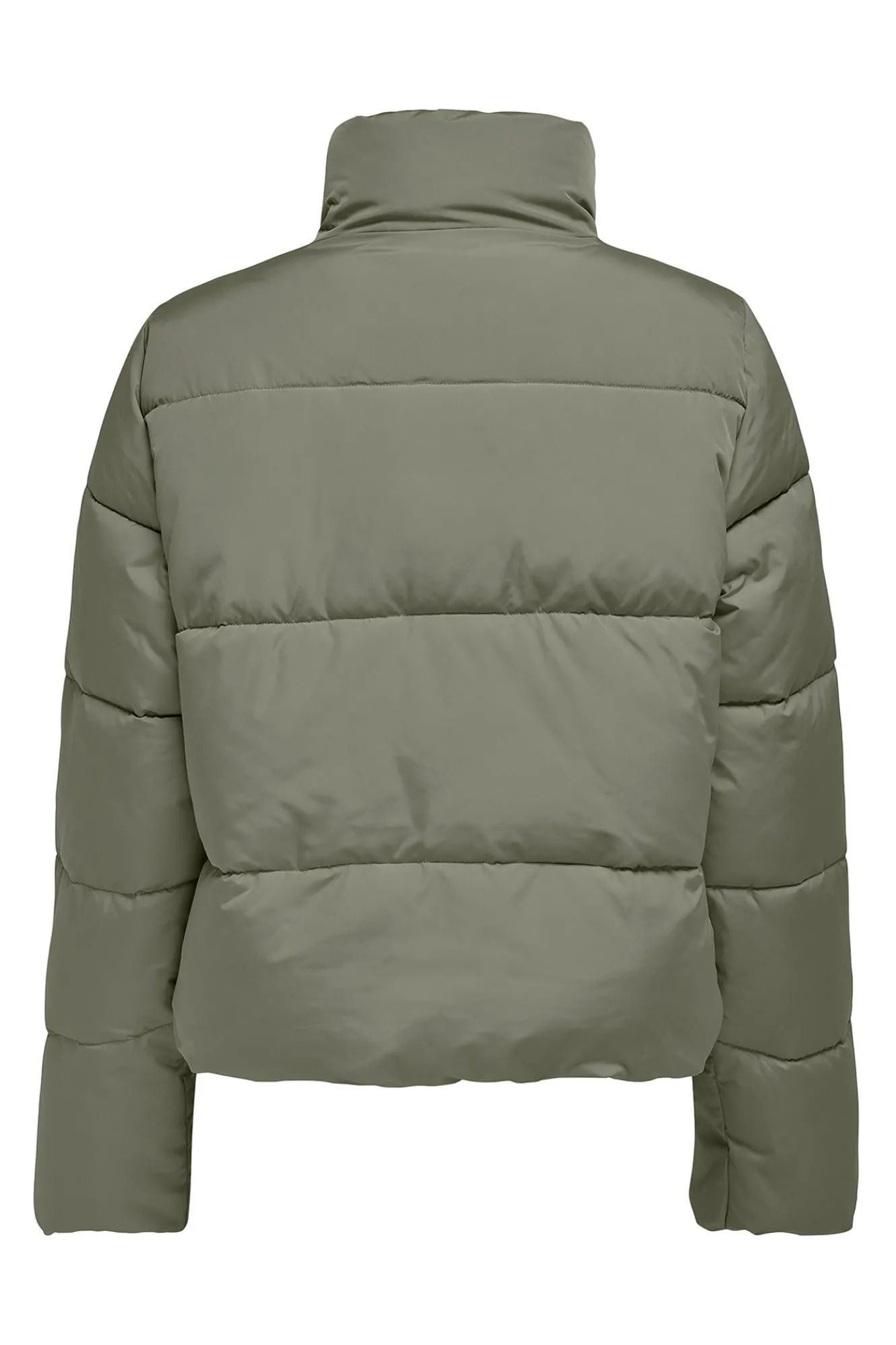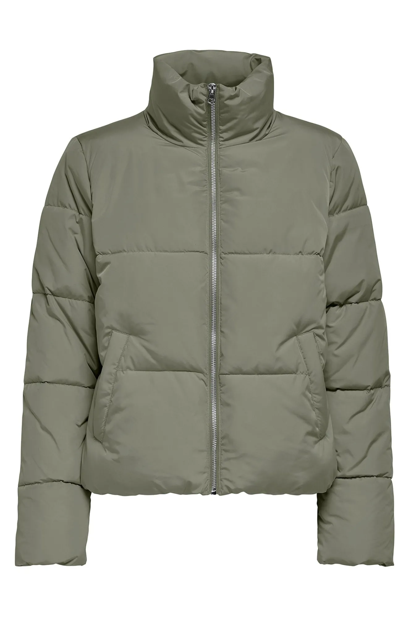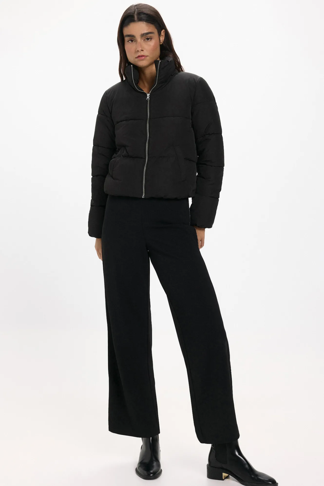 – Corte ligeramente cropped, manga larga, cuello alto, cierre de cremallera frontal y bolsillos laterales.