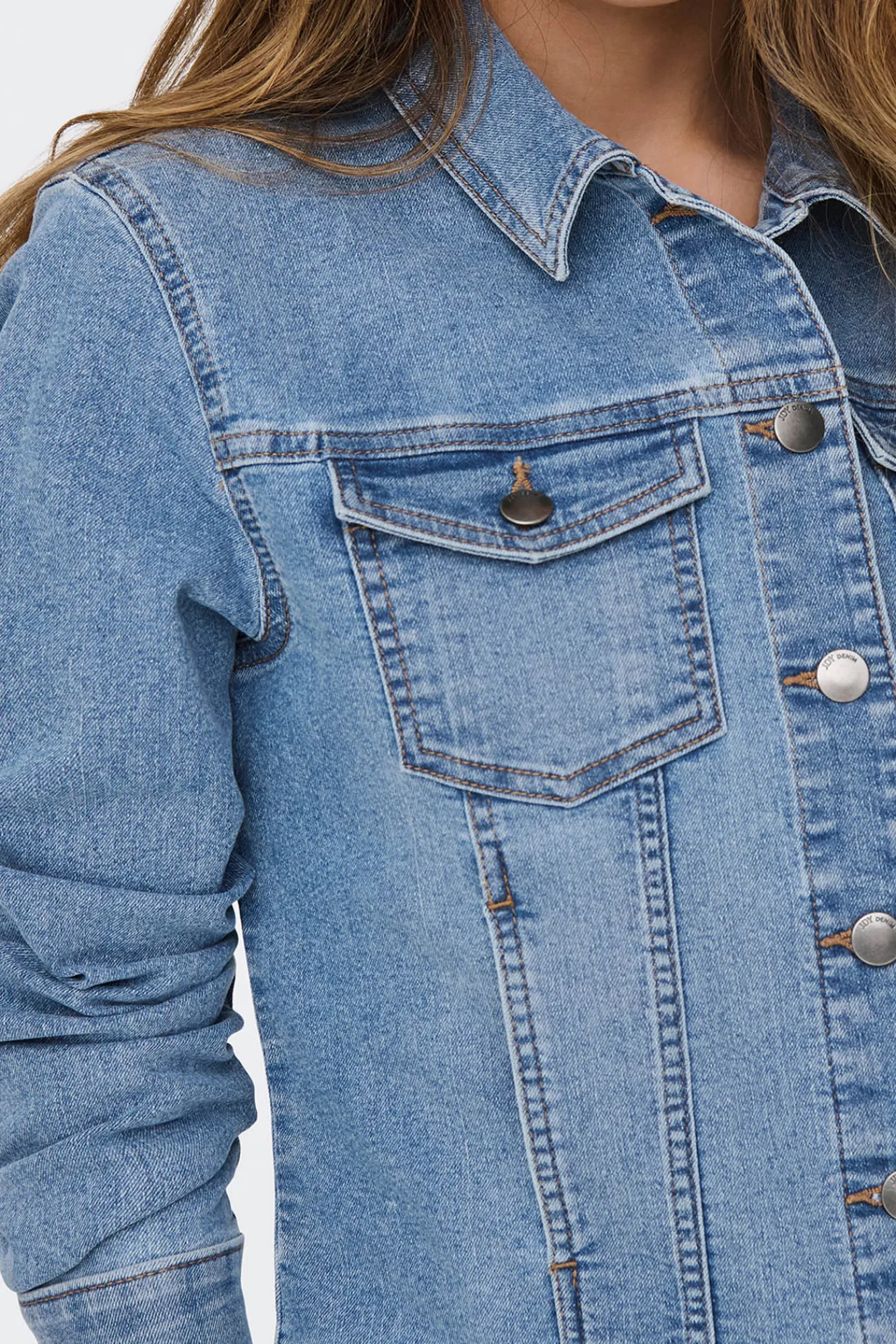 – Corte ajustado, cuello clásico, cierre de botones delantero y bolsillos frontales superiores con solapas.