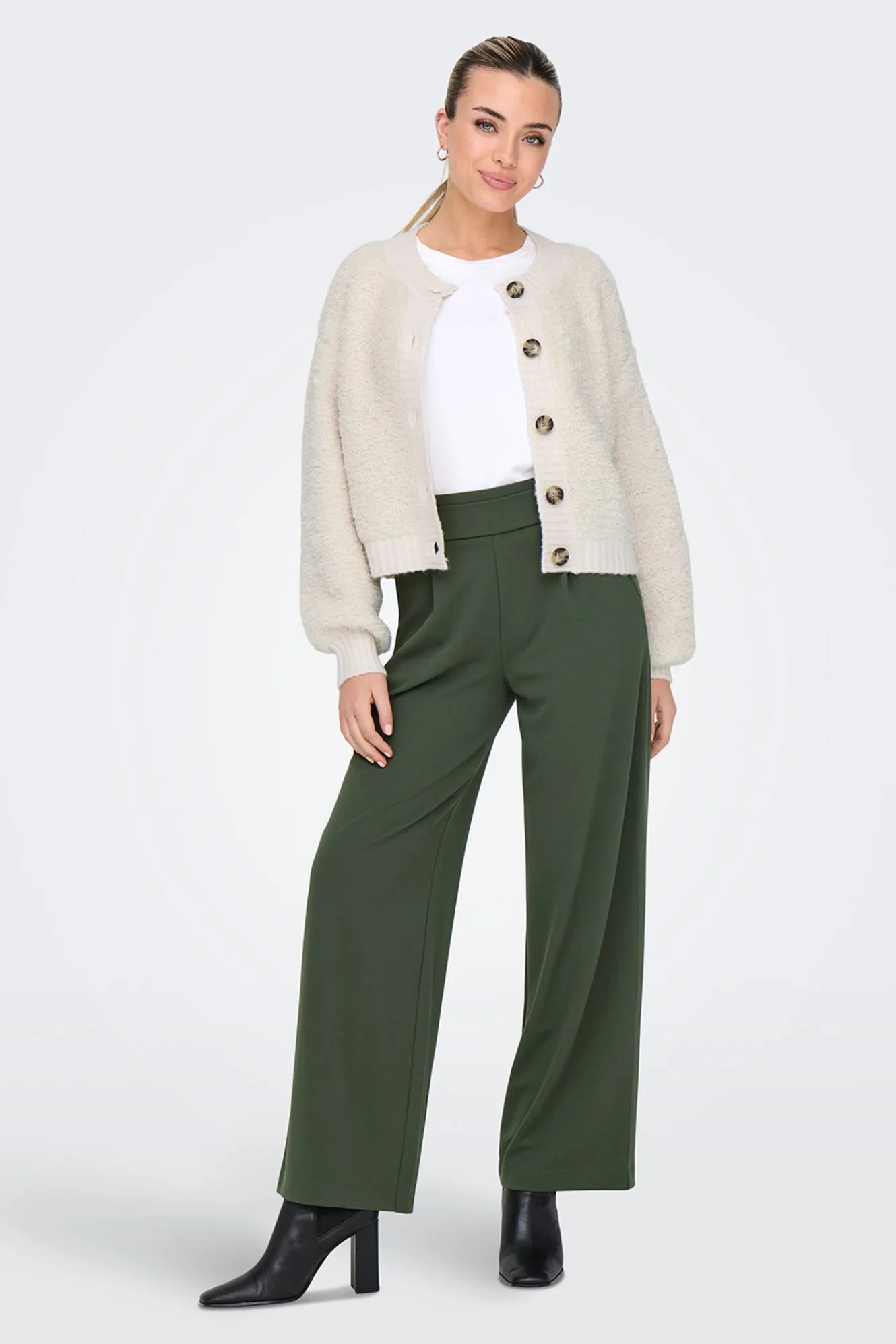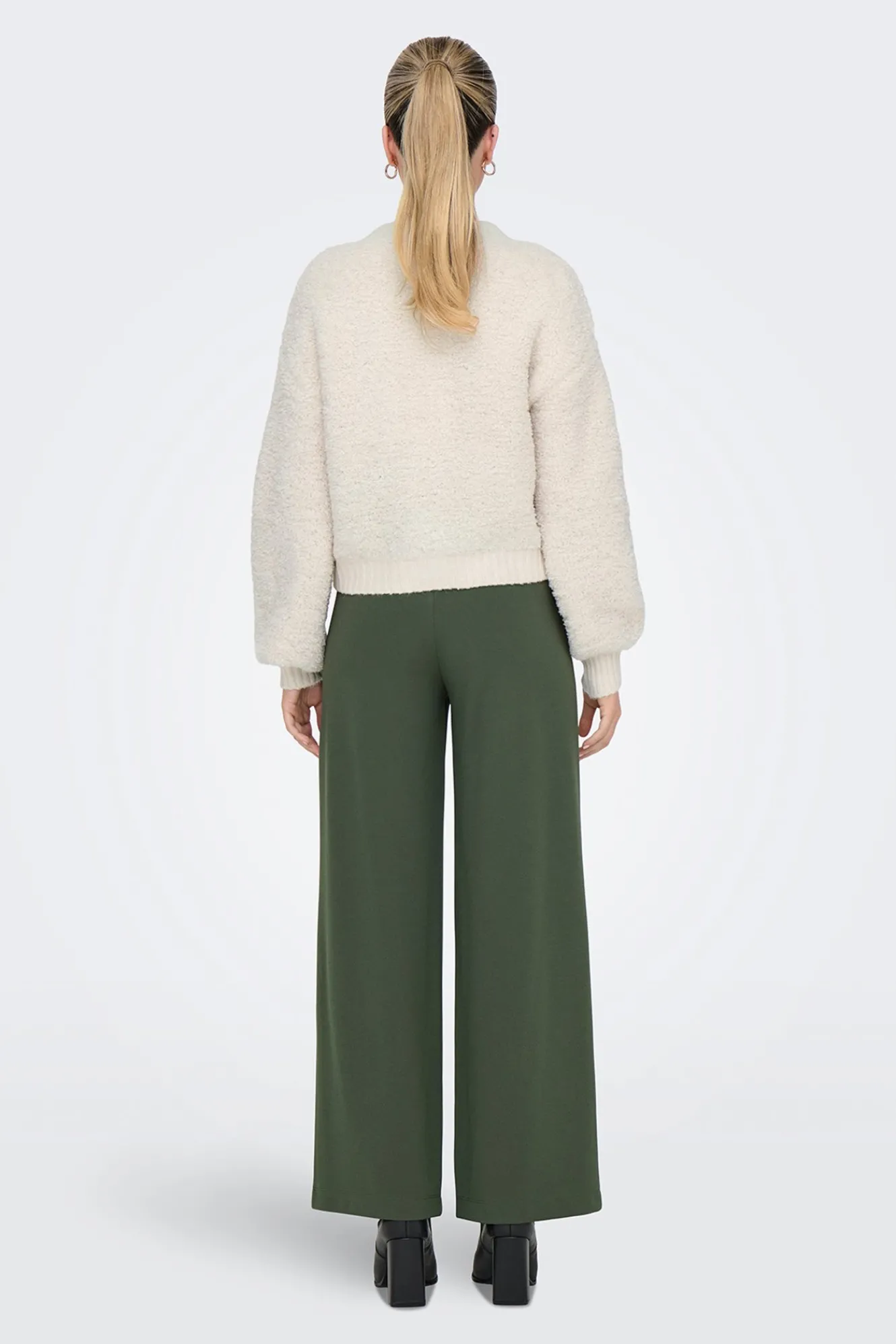 – Corte holgado, manga larga ligeramente abullonada y cuello redondo.