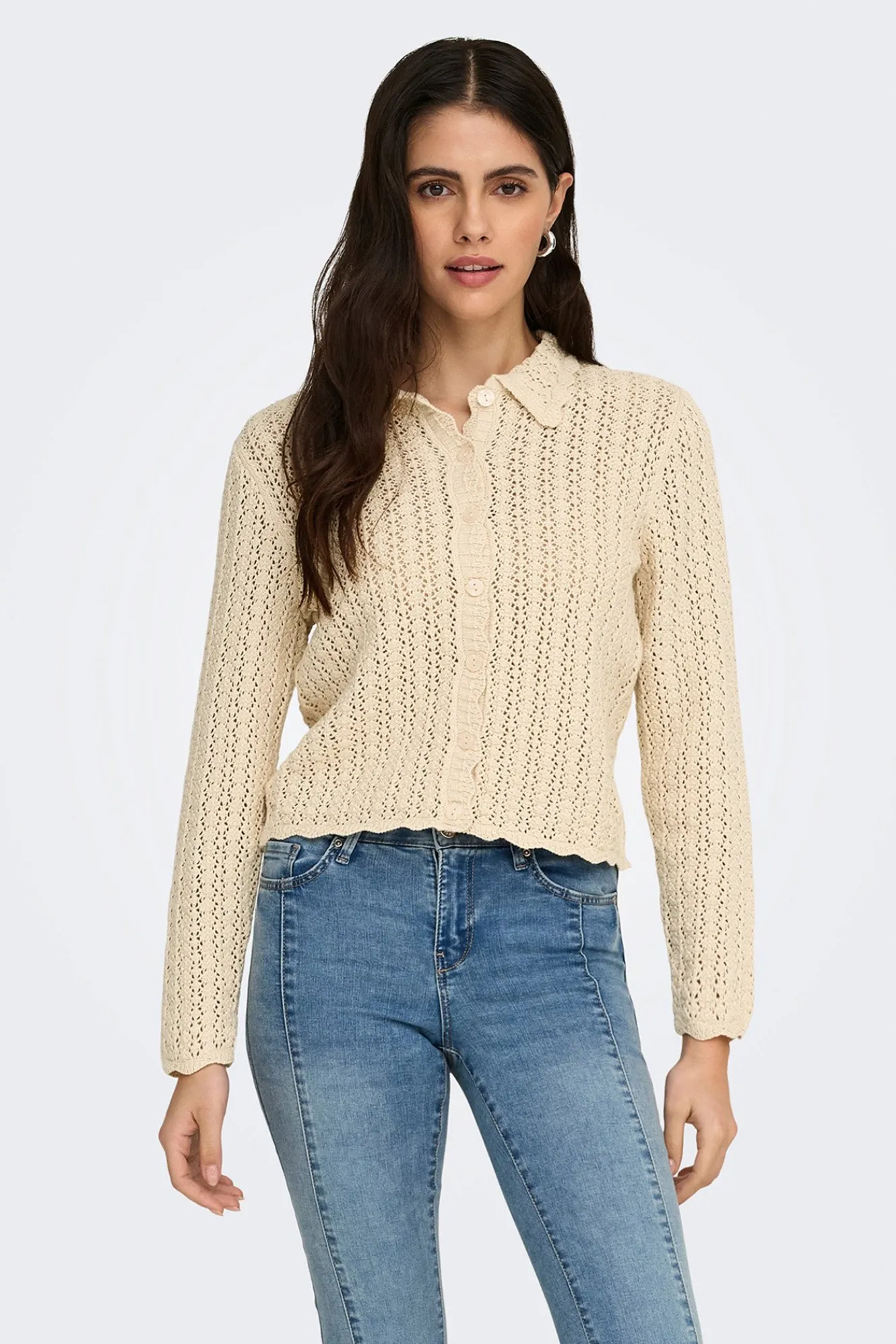 – Corte recto, manga larga, cuello clásico y cierre de botones delantero.