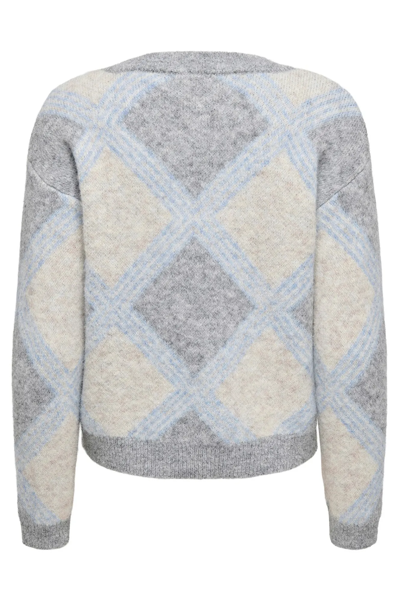 – Corte recto, manga larga, bordes acanalados y estampado geométrico.