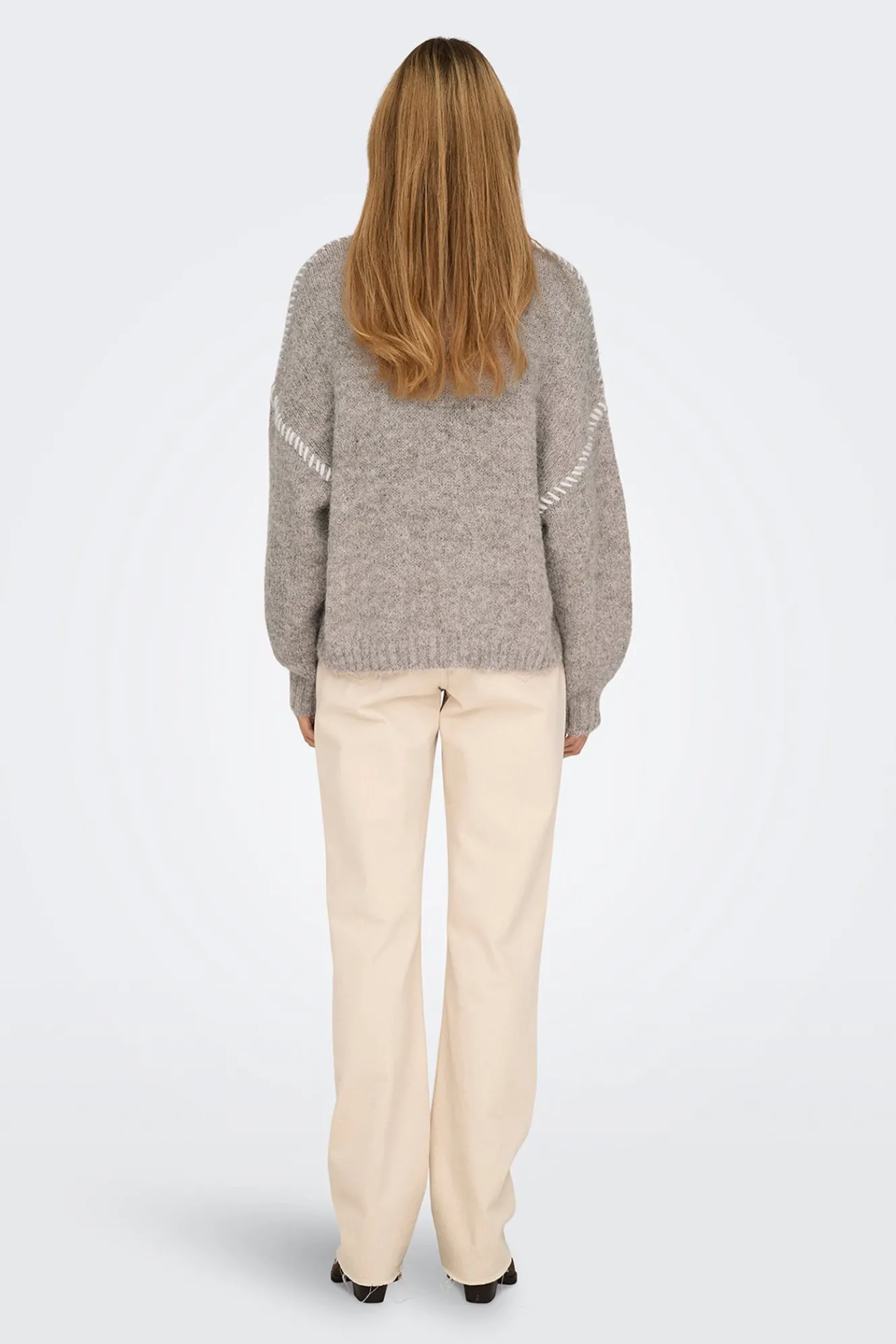 – Corte holgado, manga larga abullonada y costuras decorativas a contraste.