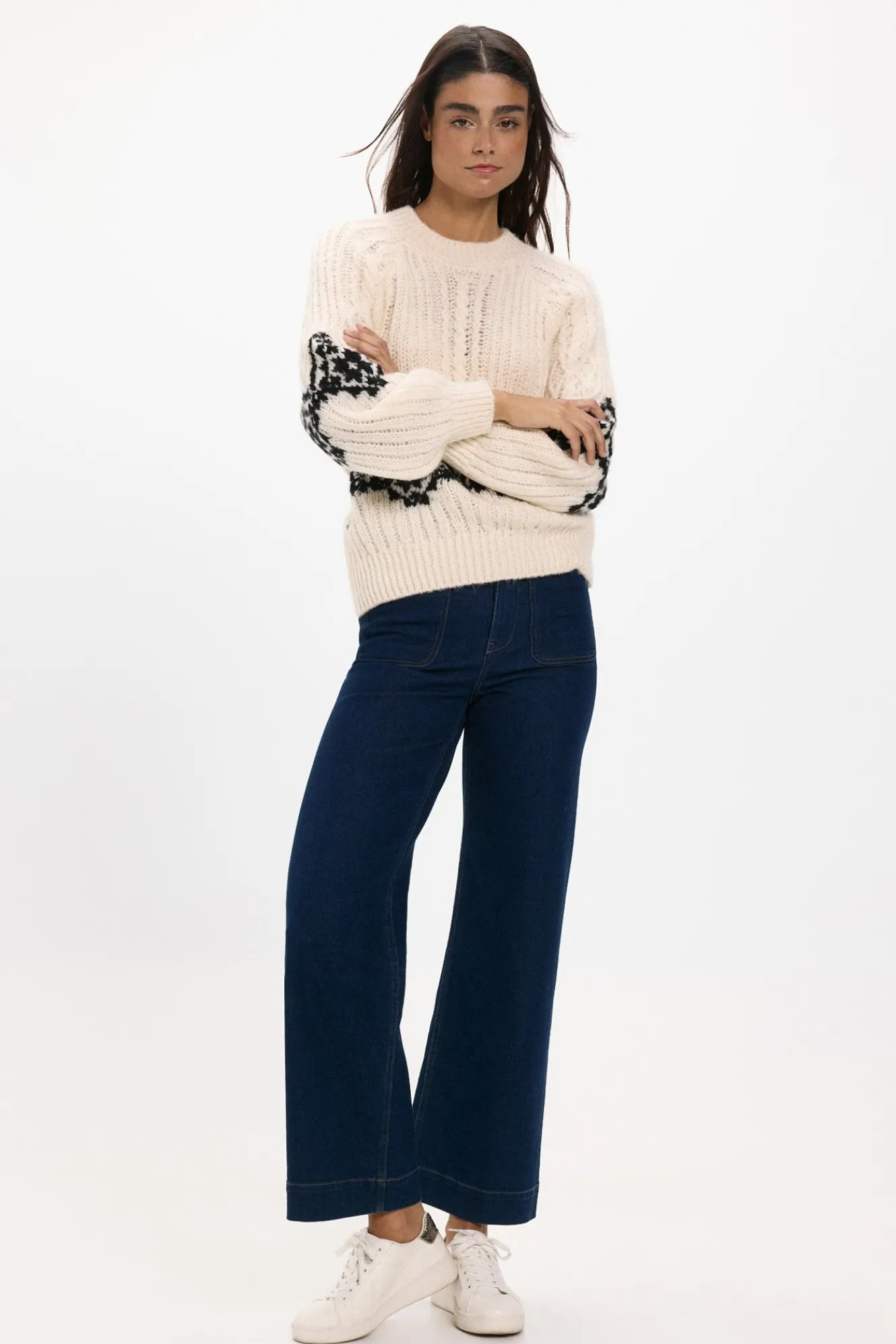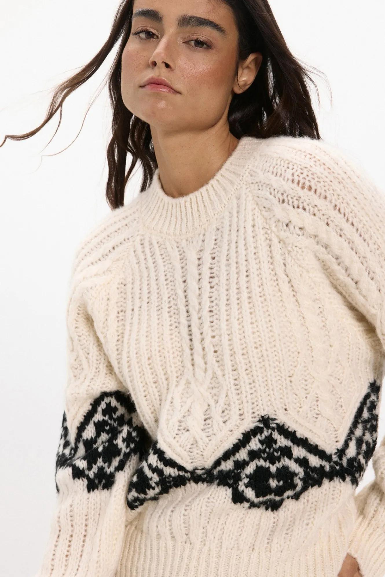 – Corte recto, manga larga ligeramente abullonada, patrón trenzado y detalle a contraste de dibujo geométrico.