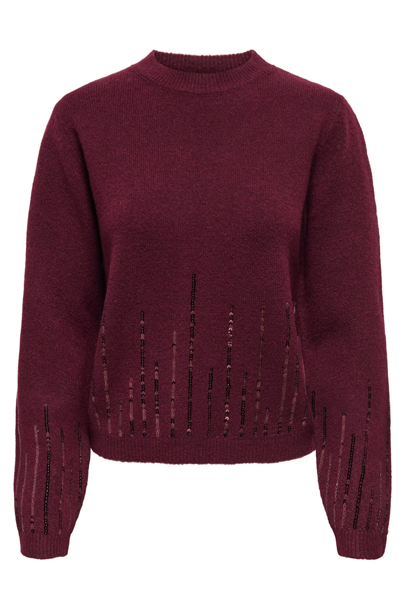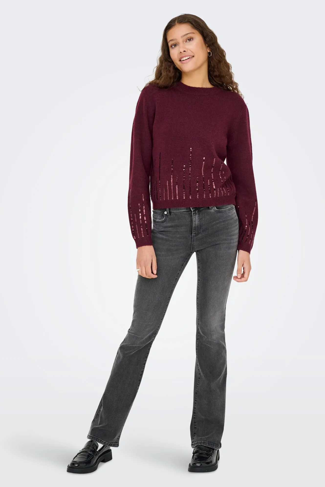 – Corte regular, manga larga y detalle de lentejuelas.