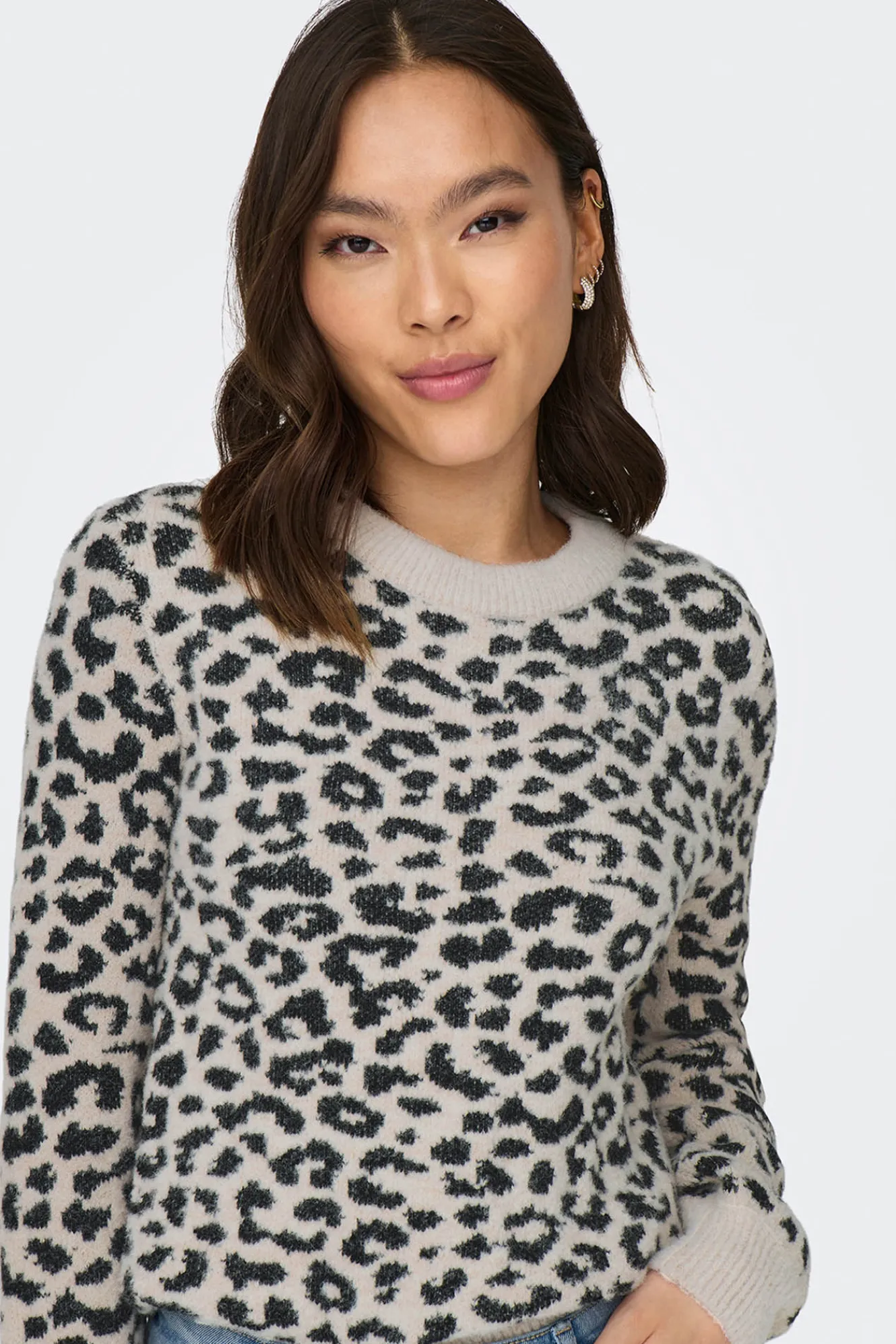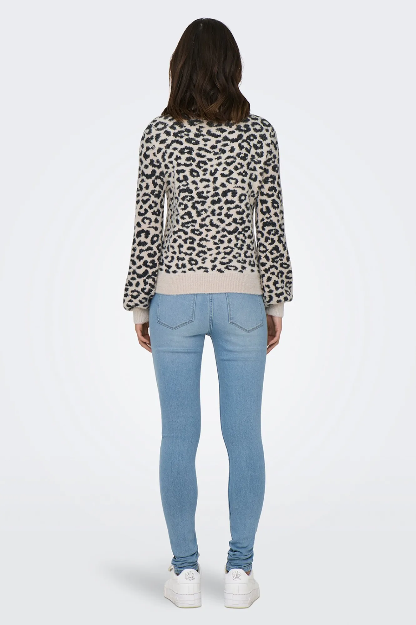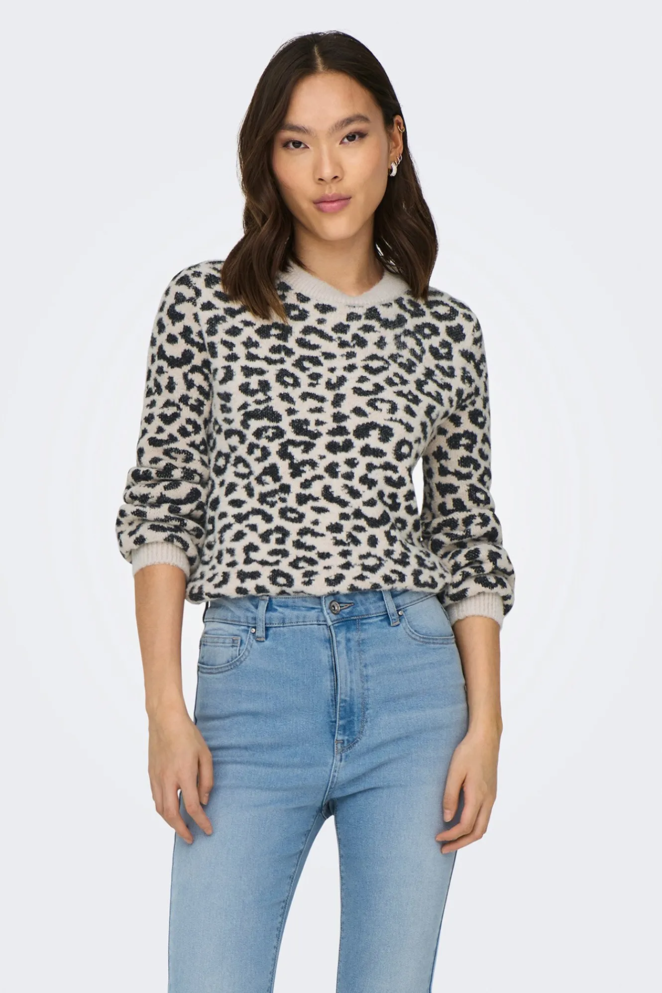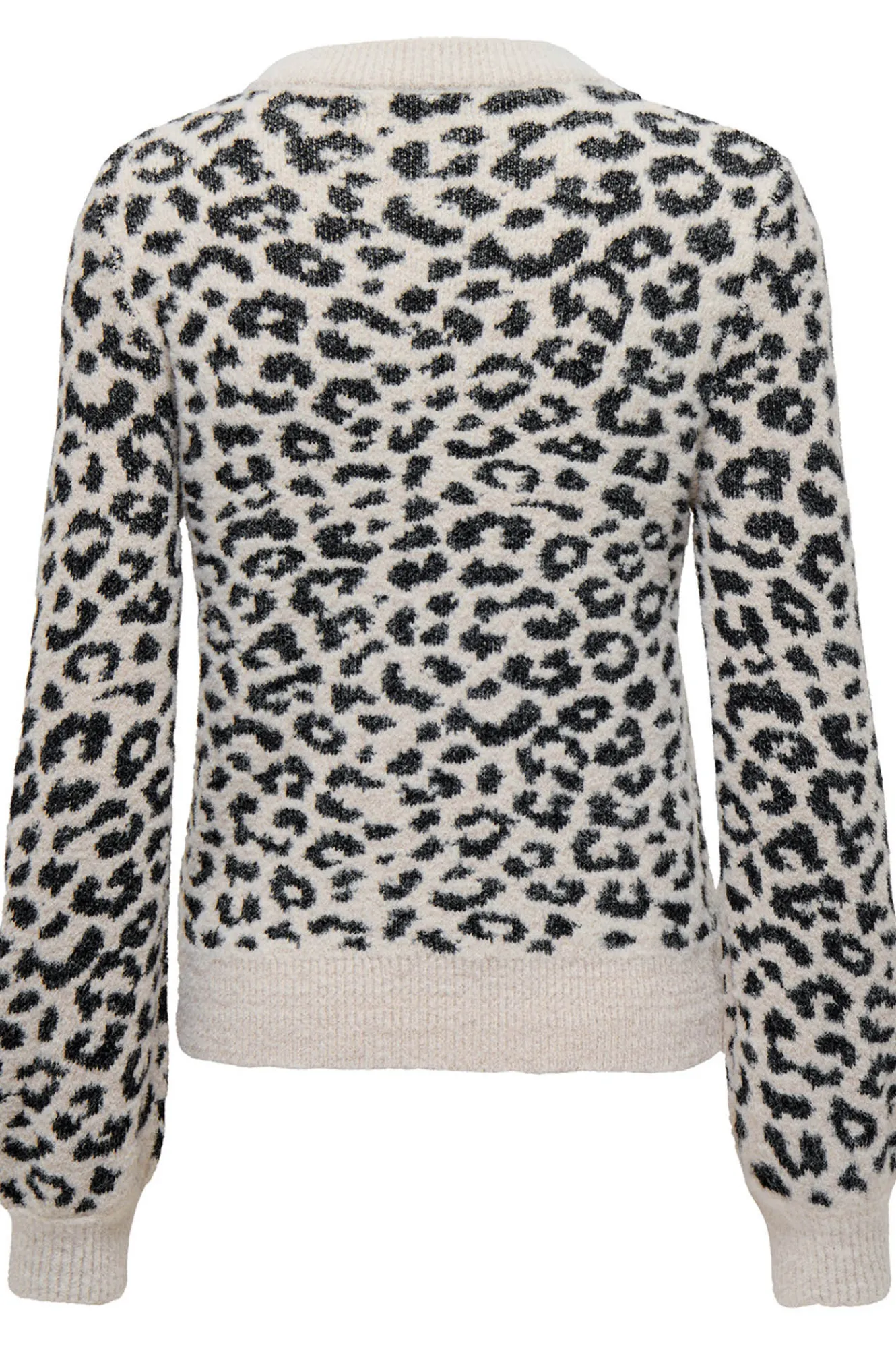 – Corte holgado, manga larga ligeramente abullonada y estampado animal print.