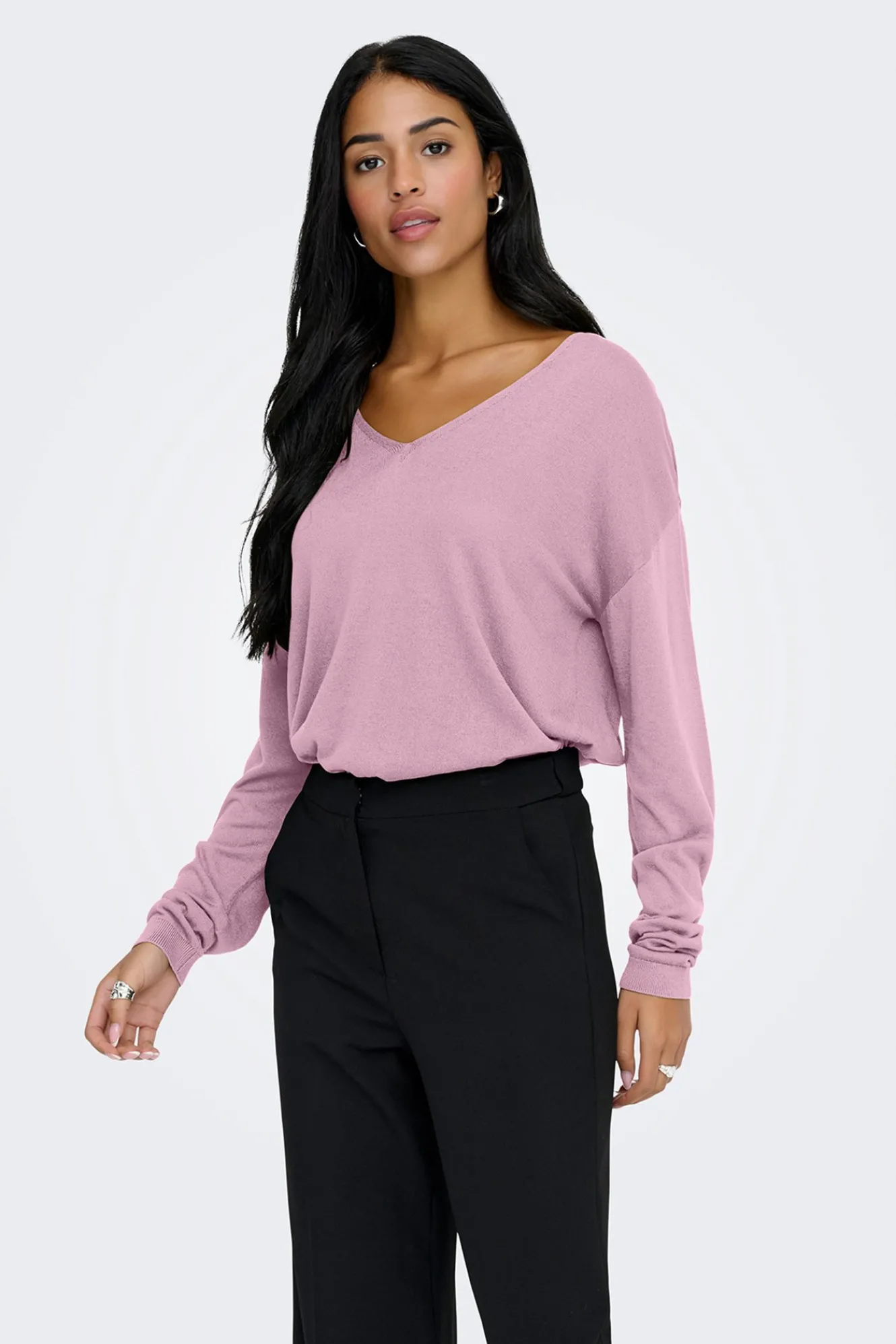 – Corte holgado, manga larga y bajos acanalados.
