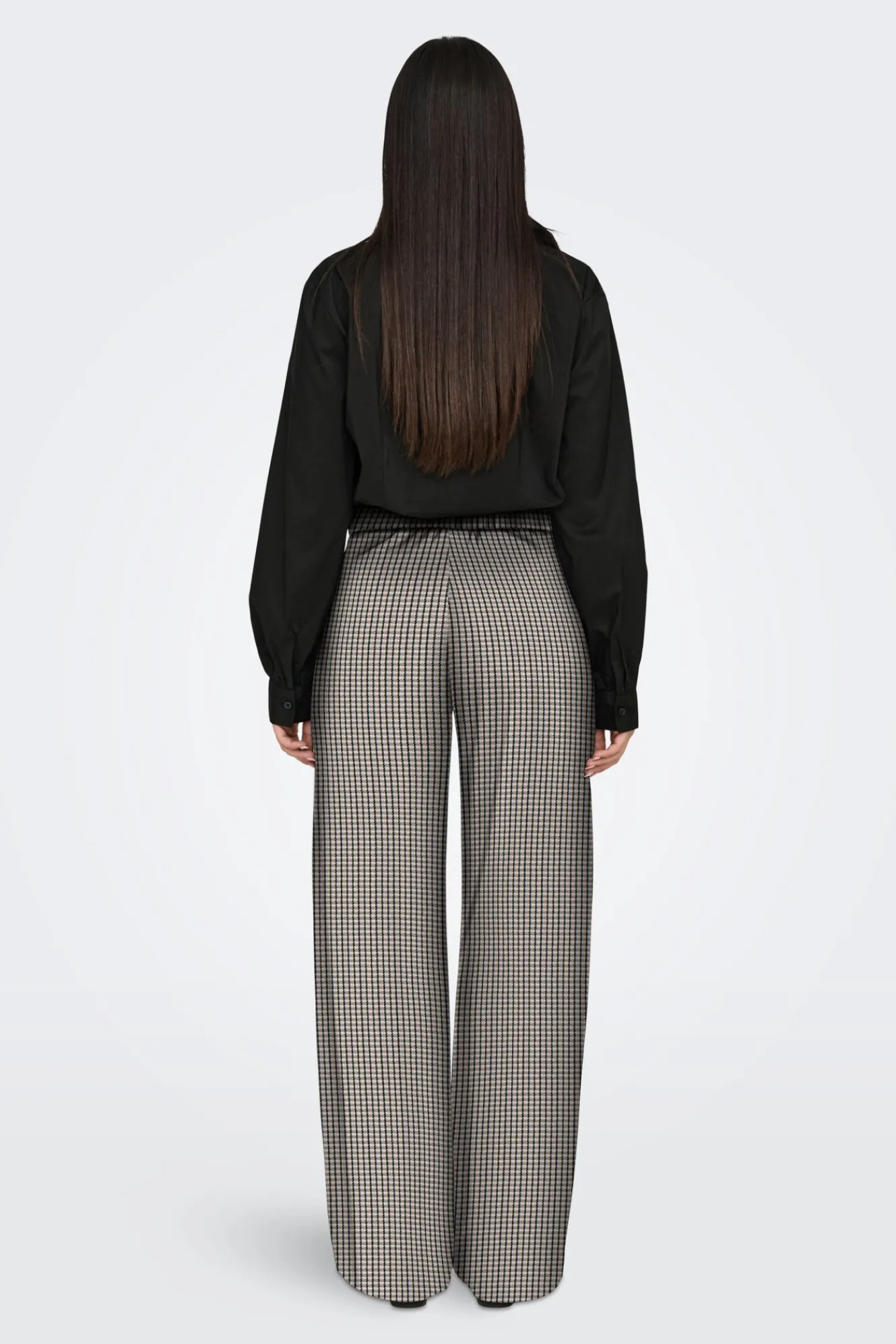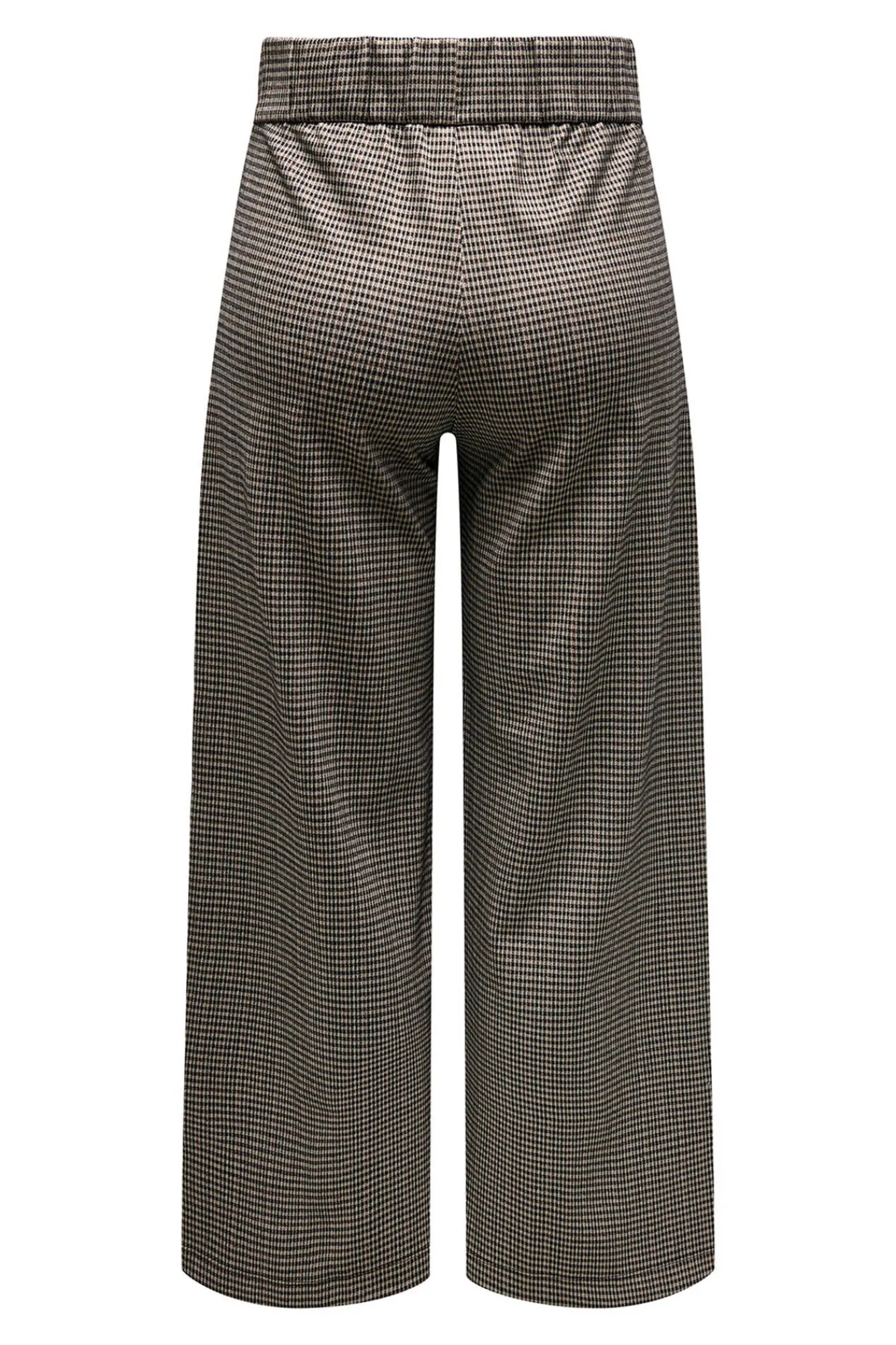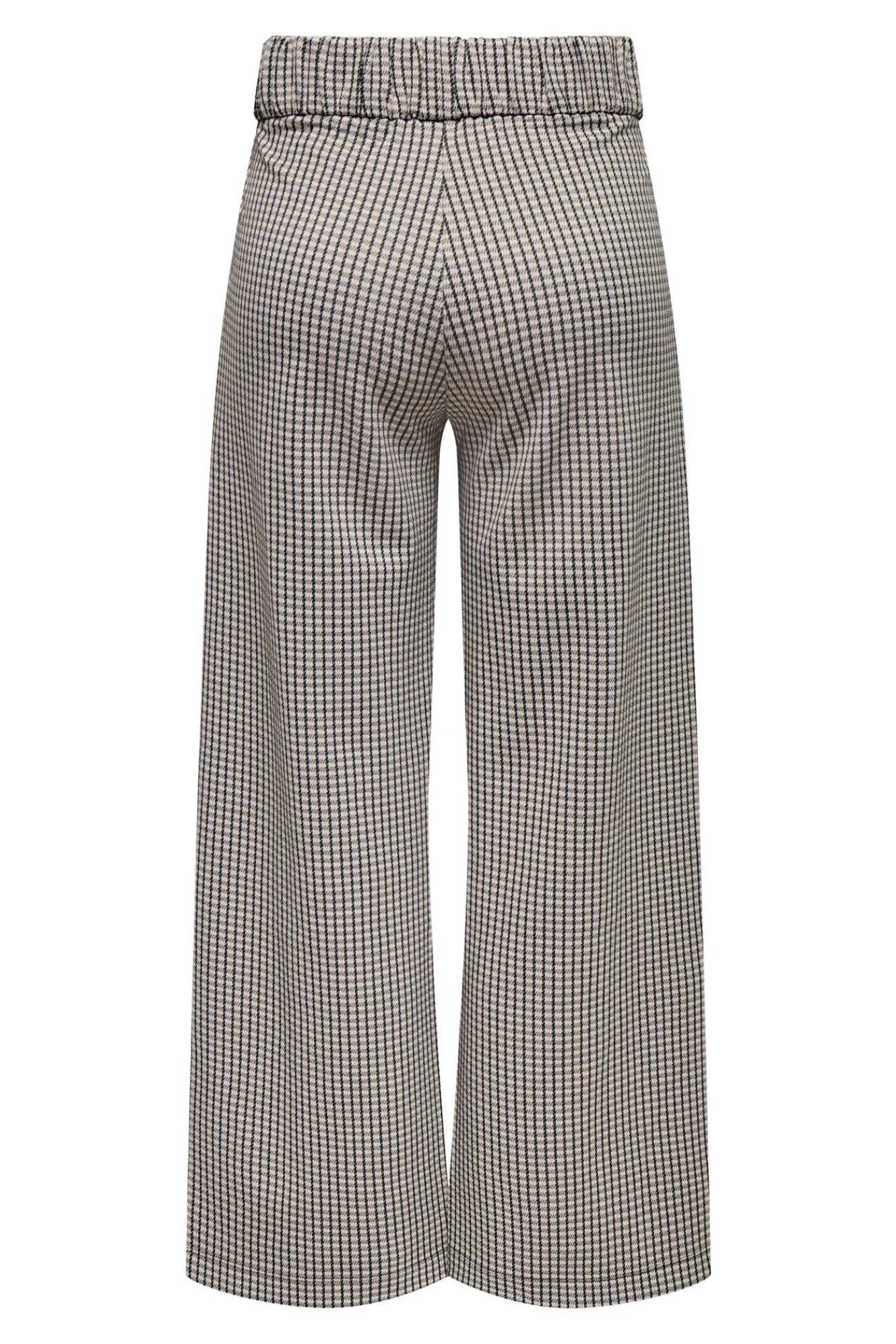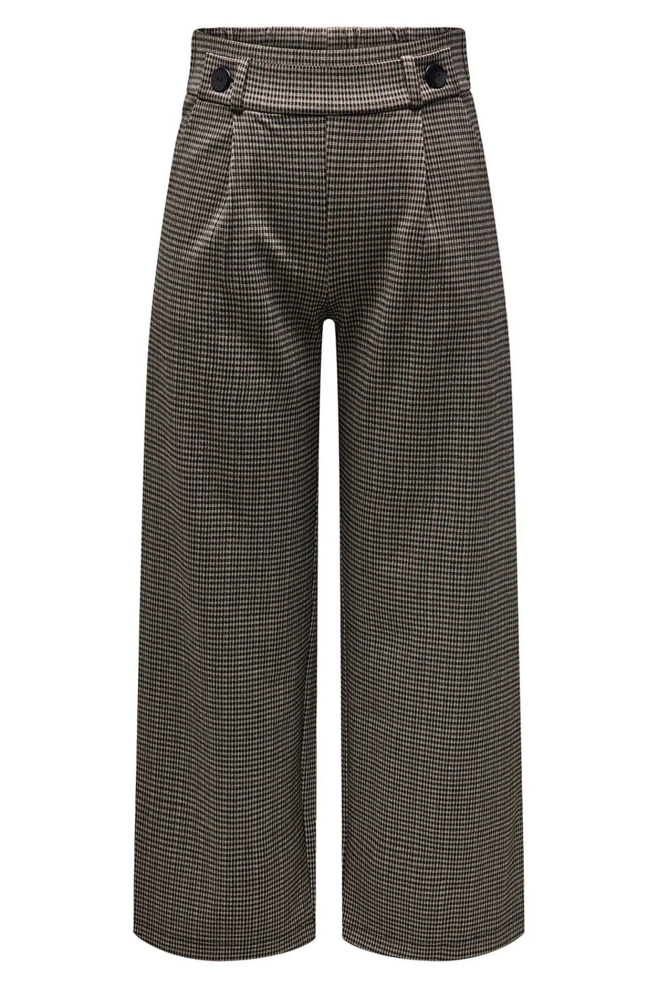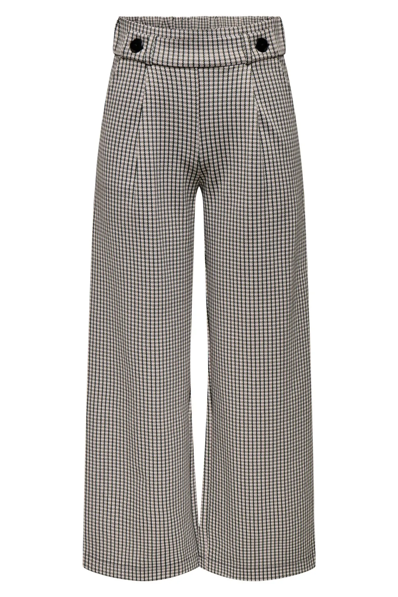 – Estampado de cuadros, tiro alto, cintura elástica con botones decorativos, bolsillos laterales y pinzas frontales.