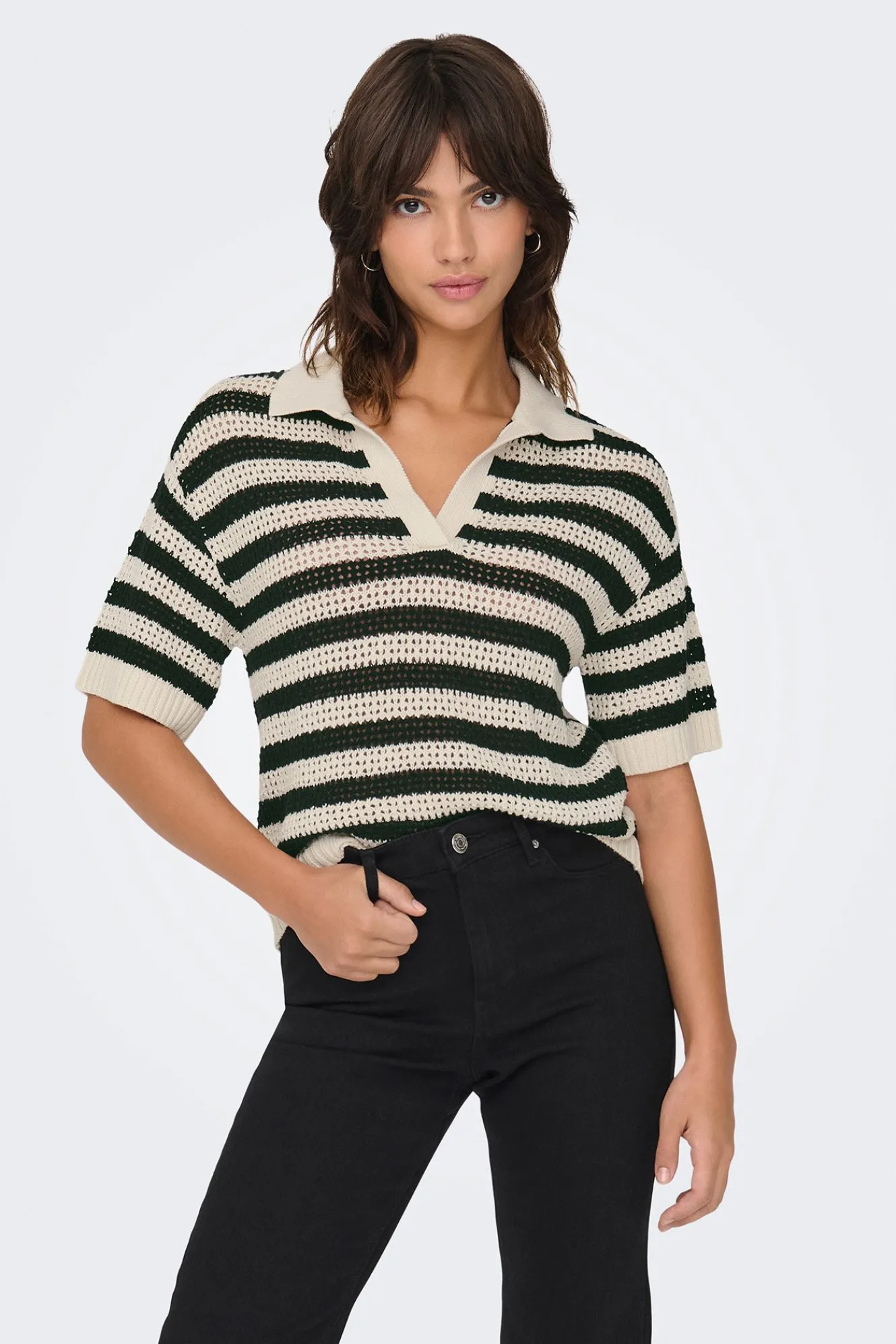 – Corte recto y relajado, cuello polo con pico y manga corta.
