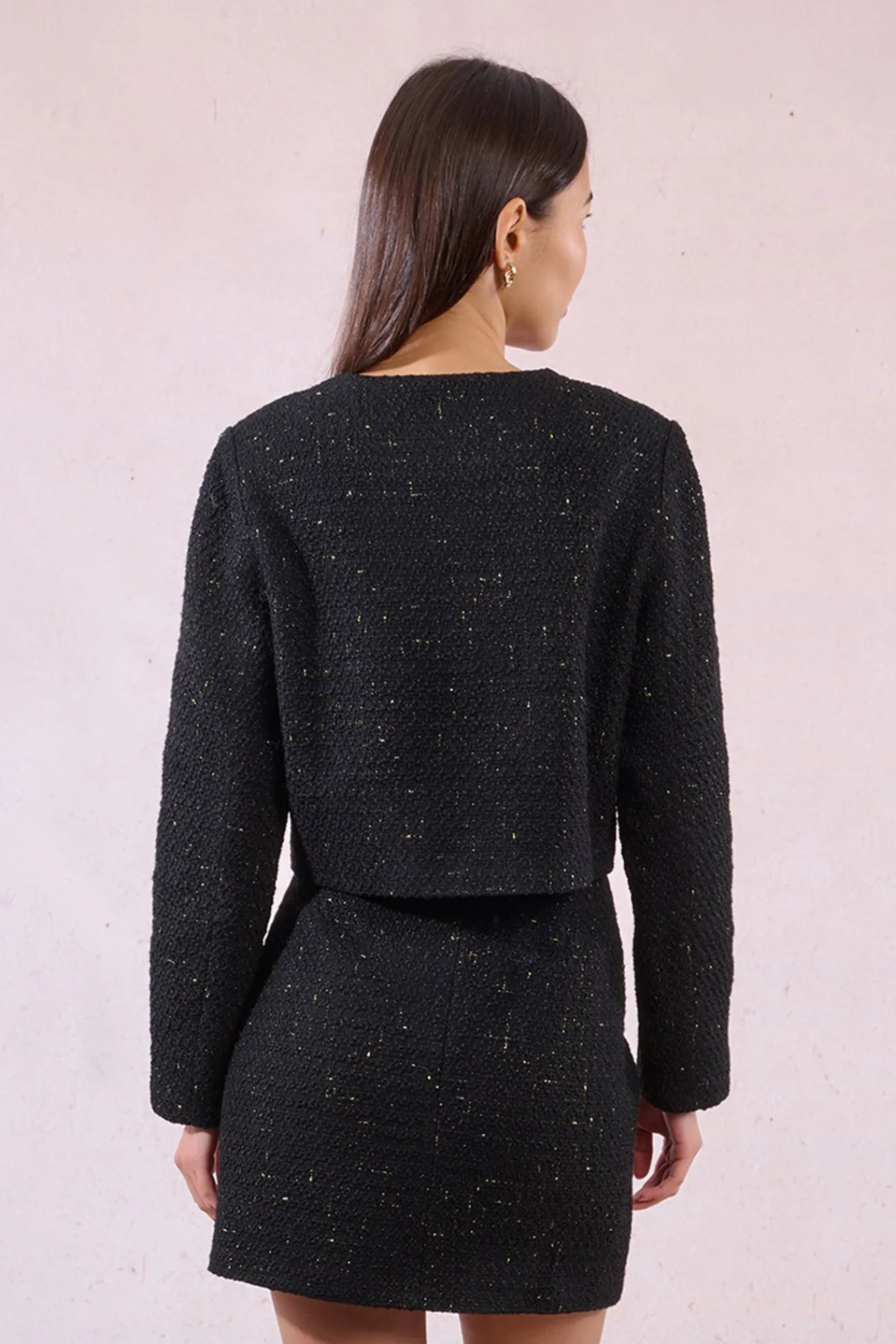 – Modelo en tejido de tweed, con bolsillos frontales y corazones.