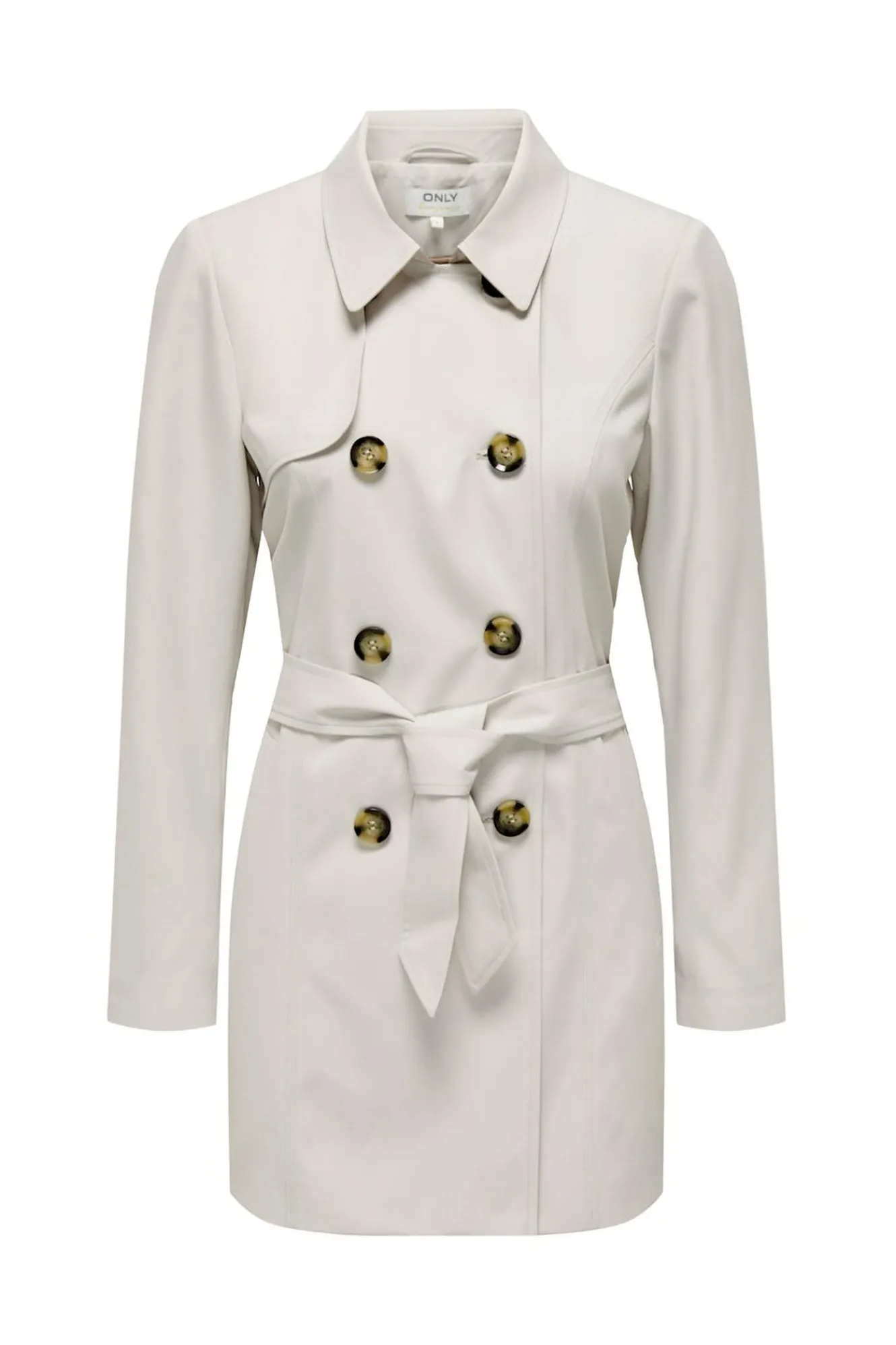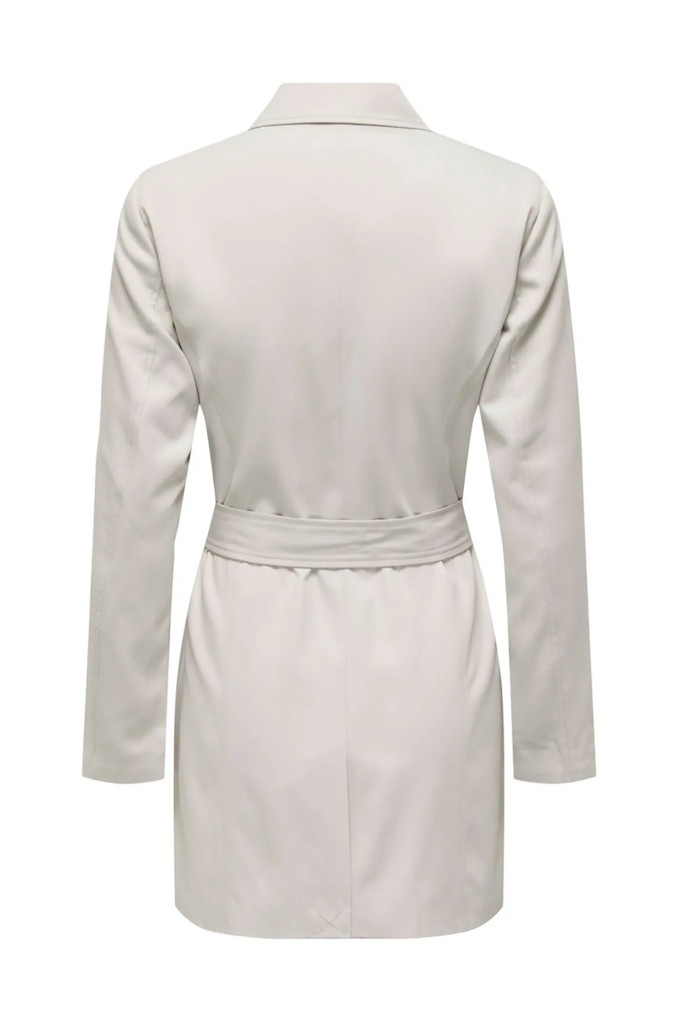 – Cierre frontal cruzado con botonadura doble y cinturón del mismo tejido.