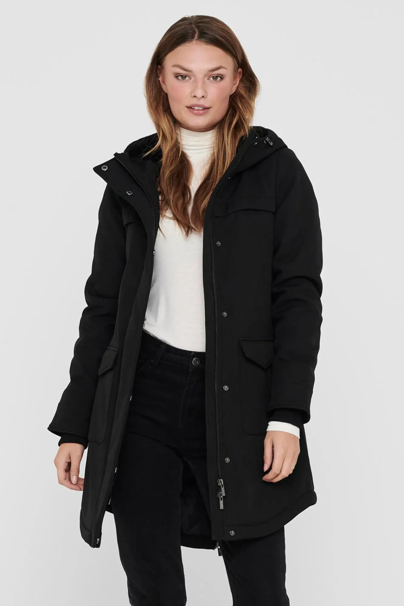 – Cuello alto con capucha regulable incorporada.