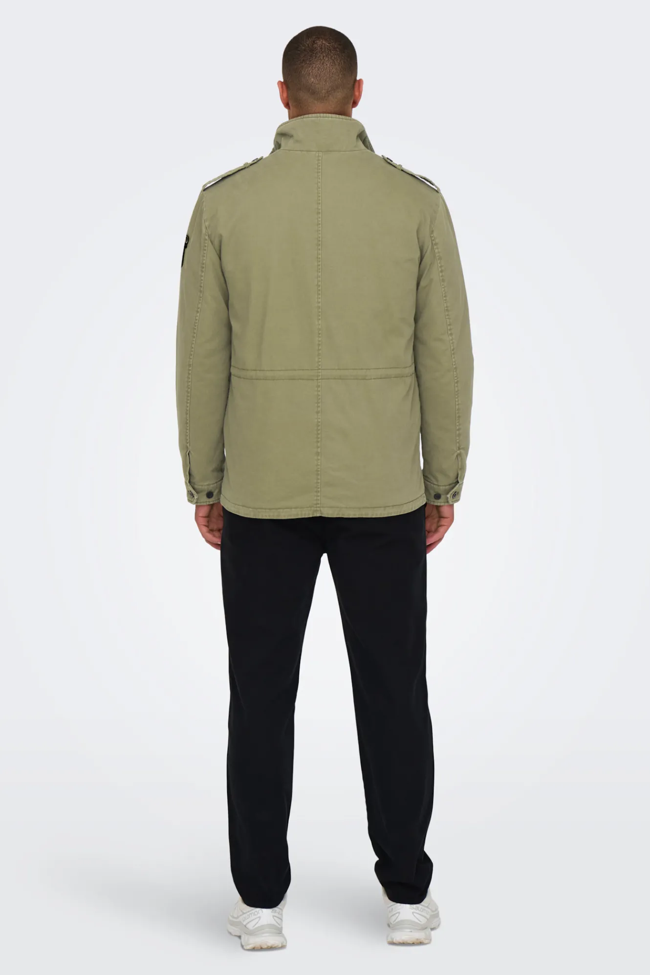 – Corte recto, manga larga, cuello alto, cierre de cremallera frontal y solapa con botones a presión, bolsillos frontales con solapas, bolsillo interior y cordón ajustable y detalles de parches y bordados.