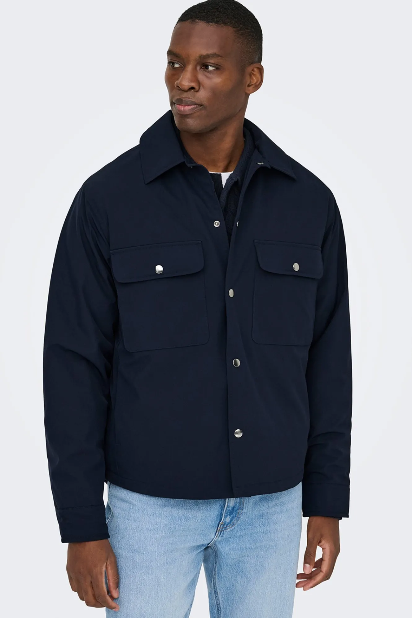 – Corte regular, cuello clásico, cierre de botones delantero y bolsillos frontales superiores.
