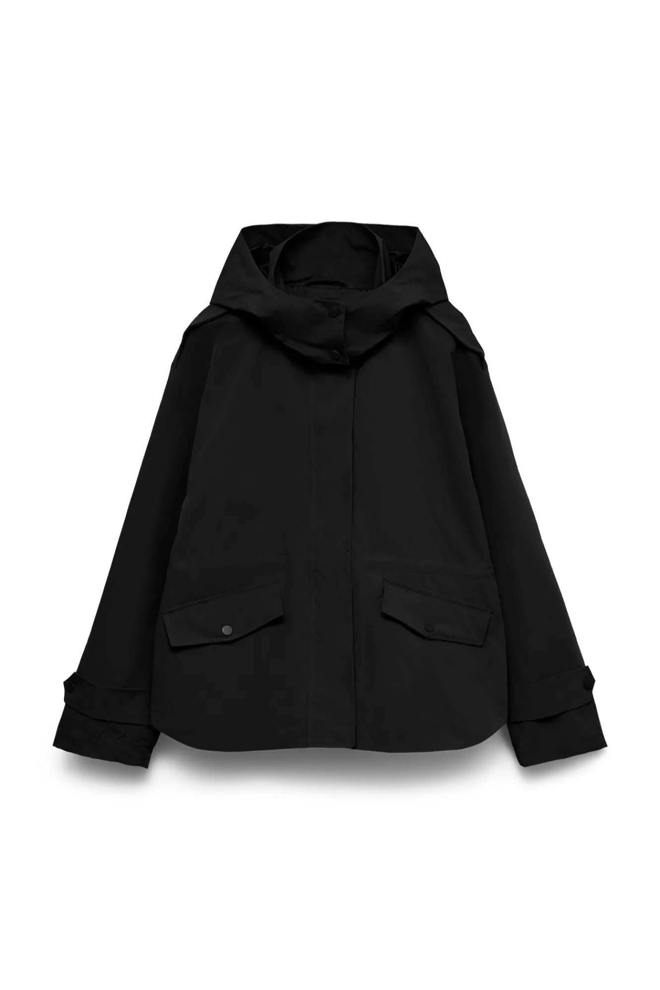 – Detalle de bolsillos frontales con cierre de solapa y botón a presión