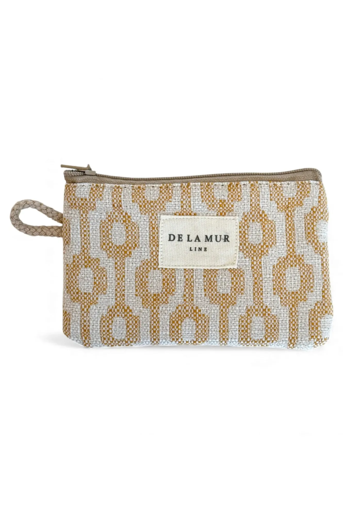 Monedero con cremallera en la parte superior y pequeña asa de cordón de color beige en el lateral. Con tejido grueso de jacquard 80% algodón y 20% poliéster con estampado geométrico en tono beige y mostaza. Cada articulo puede tener una variación en el estampado, dependiendo de donde se haya efectuado el corte de la pieza. Forrado de tejido grueso de color gris en la parte interior. Para su correcto mantenimiento se aconseja lavarlo en frío y no utilizar secadora.