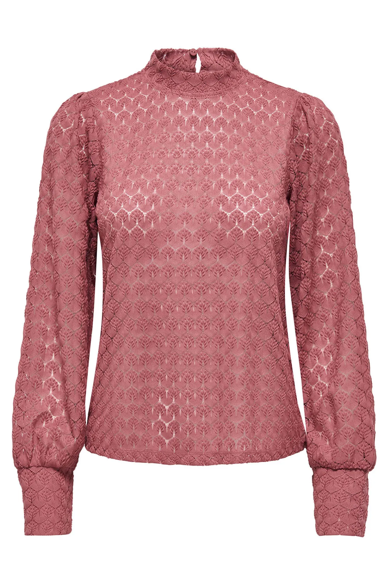 – Corte holgado, cuello perkins, manga larga abullonada con puños ajustados, cierre de botón trasero con abertura y encaje con patrón floral en relieve.