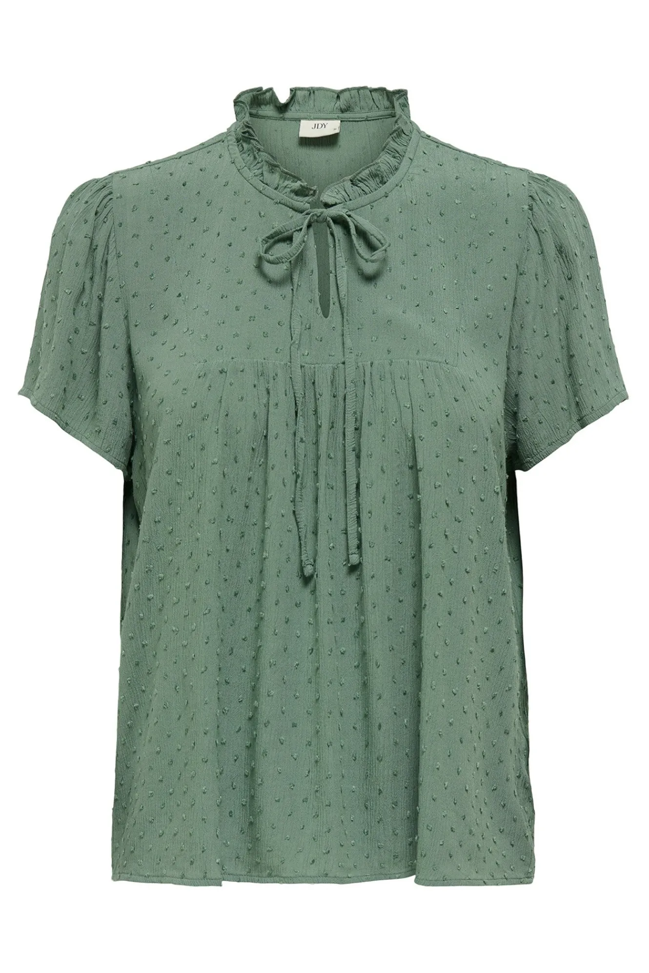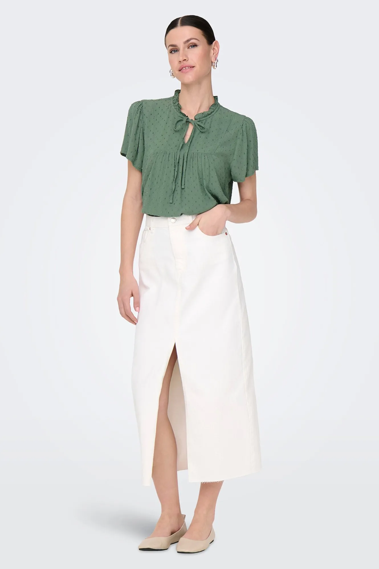 – Corte suelto, cuello perkins ondulado con abertura y cierre de lazo y manga ligeramente abullonada.