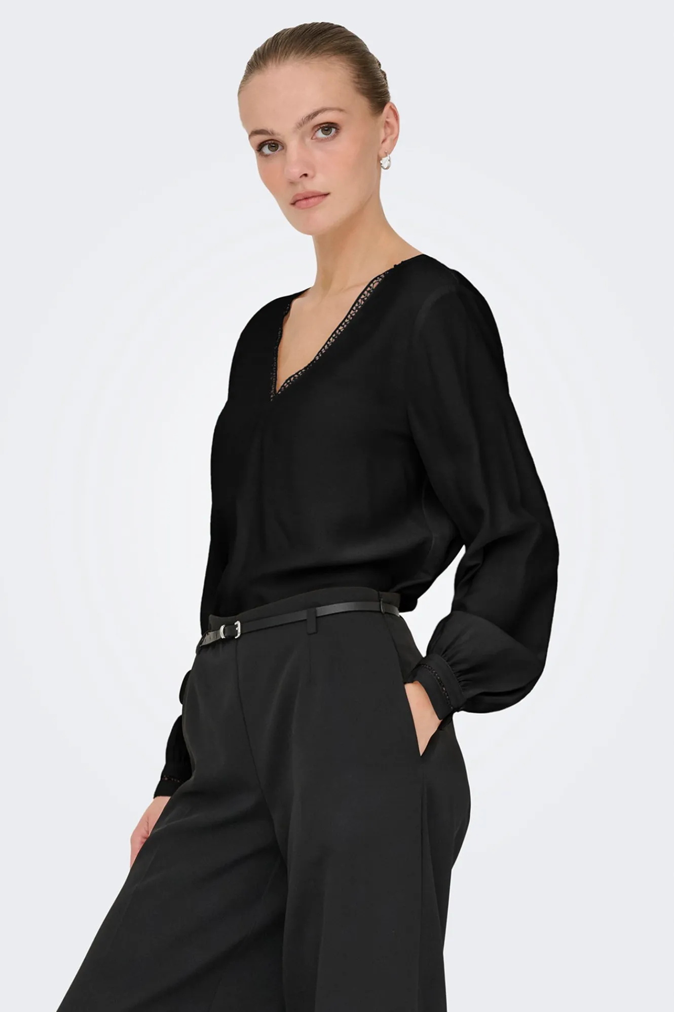 – Corte holgado, cuello pico y manga abullonada con puño ajustado.