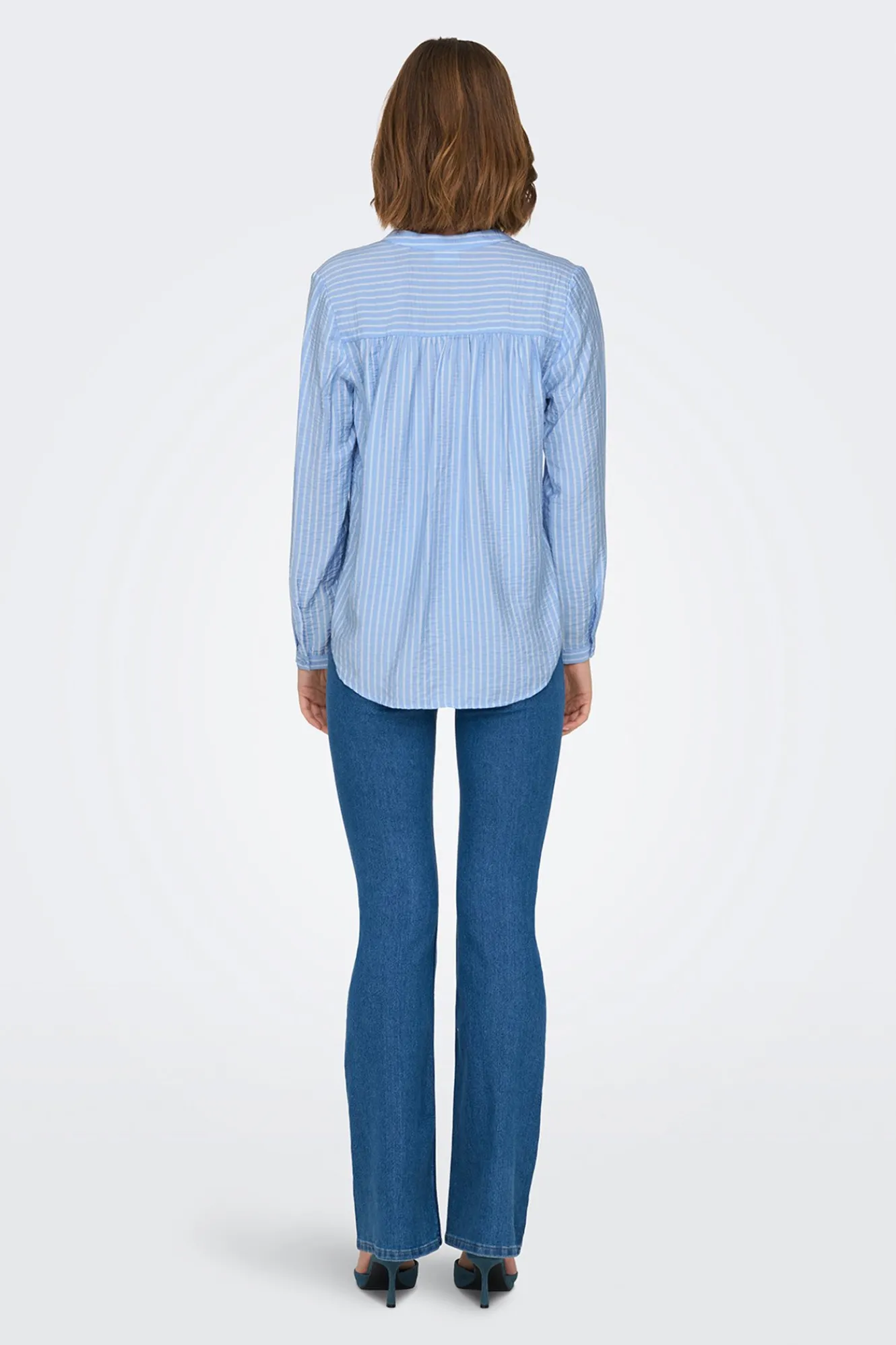– Corte holgado, cuello mao abierto en pico, manga ligeramente abullonada con puño ajustado y bajo asimétrico.