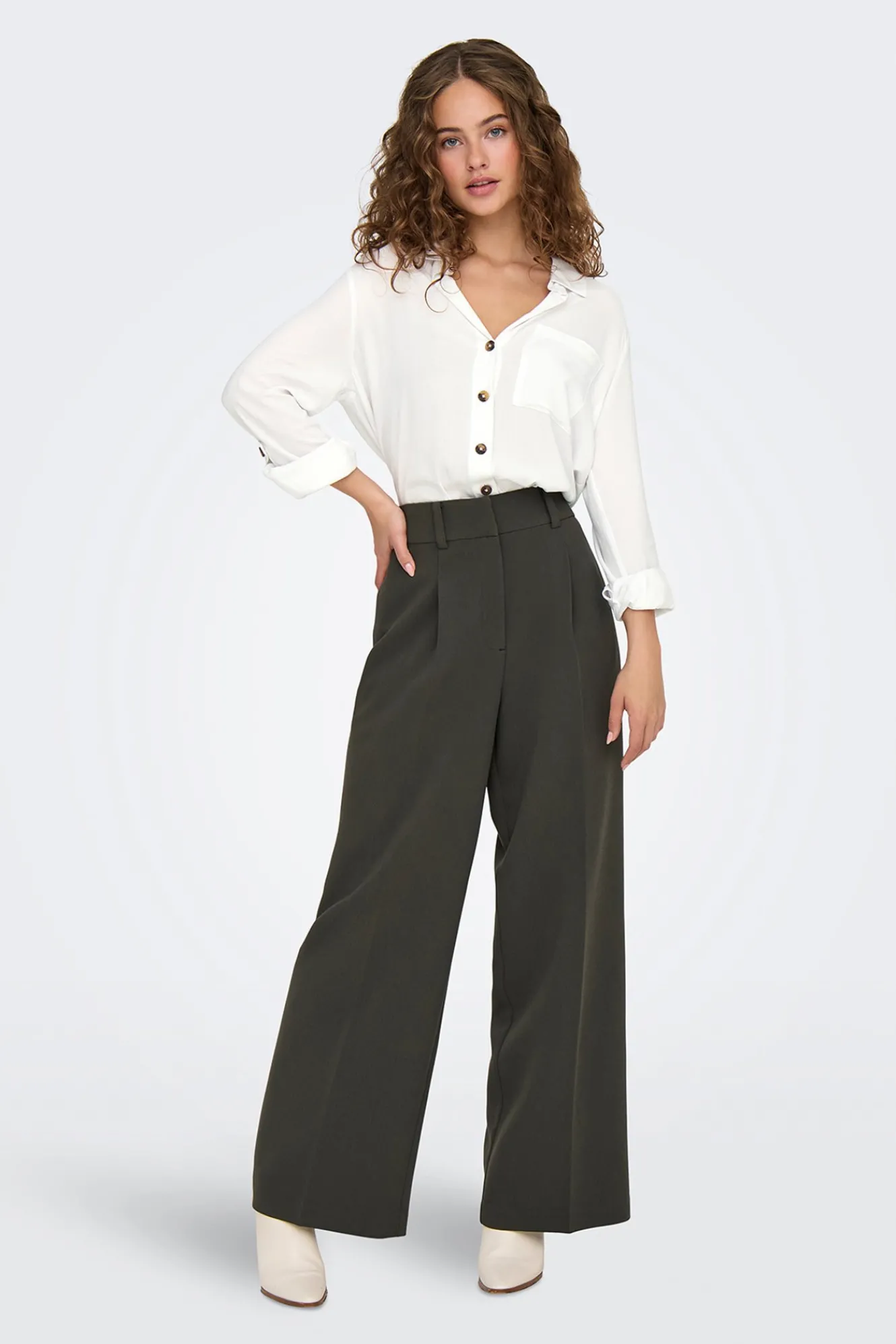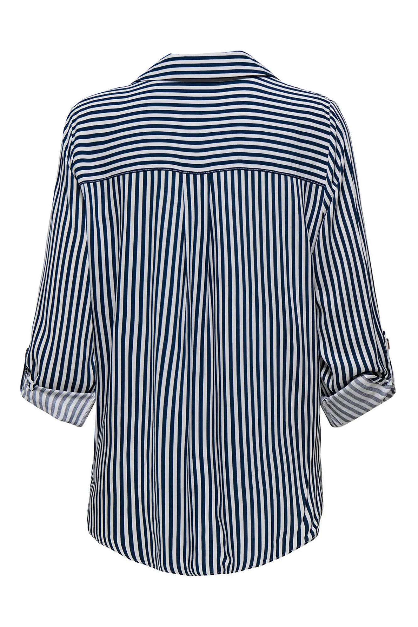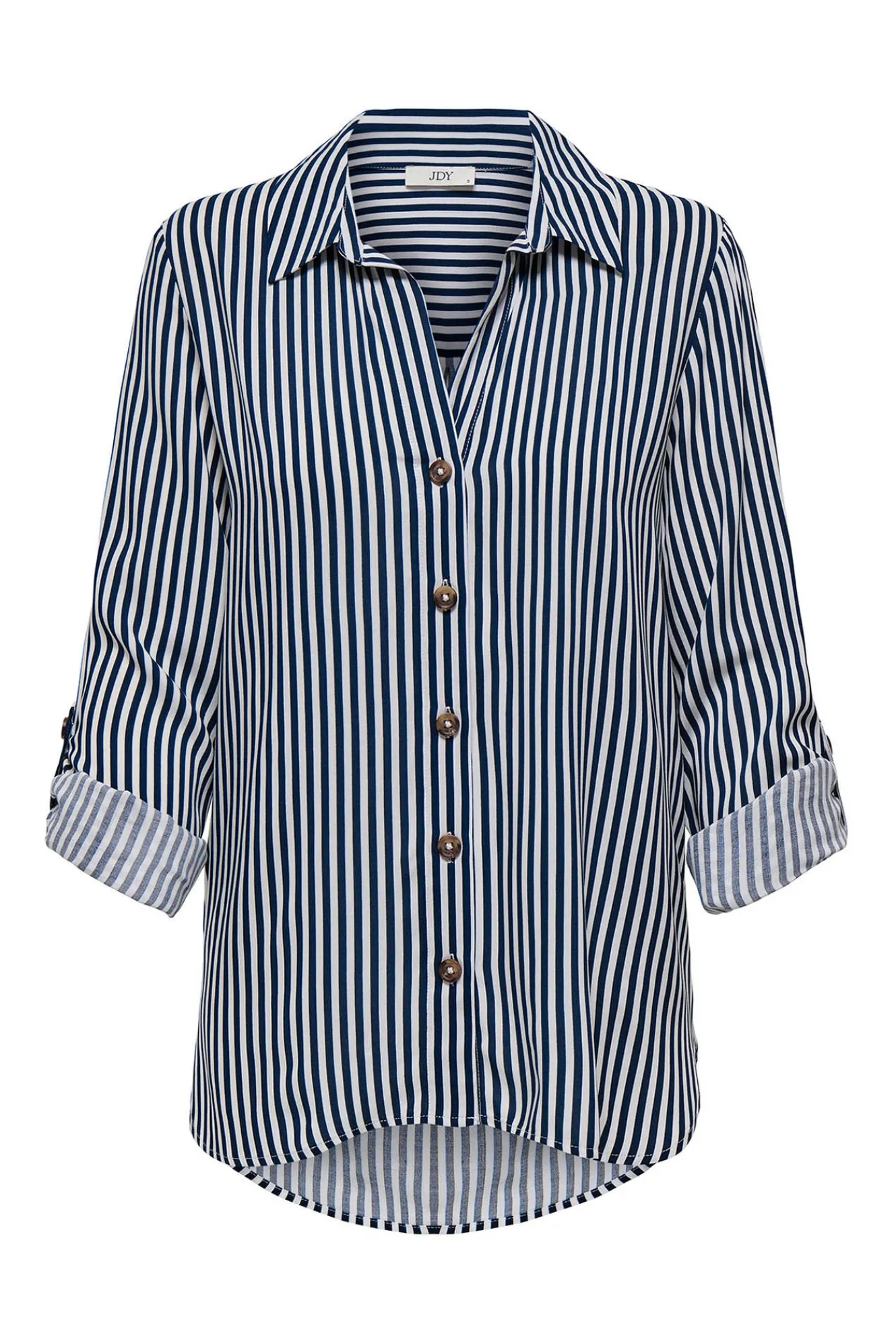 – Cuello clásico, manga ajustable con botón, cierre de botones delantero y bajo asimétrico.