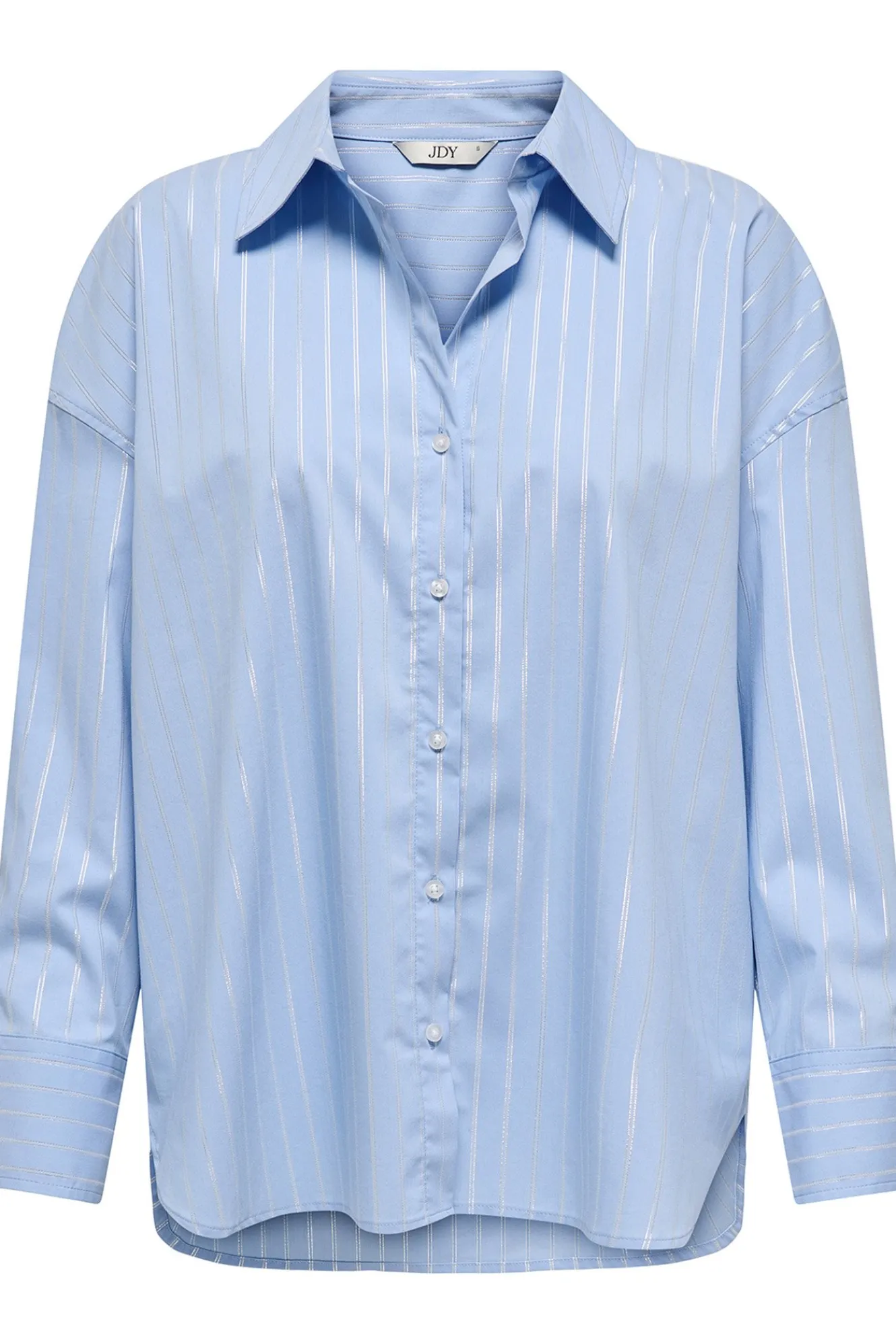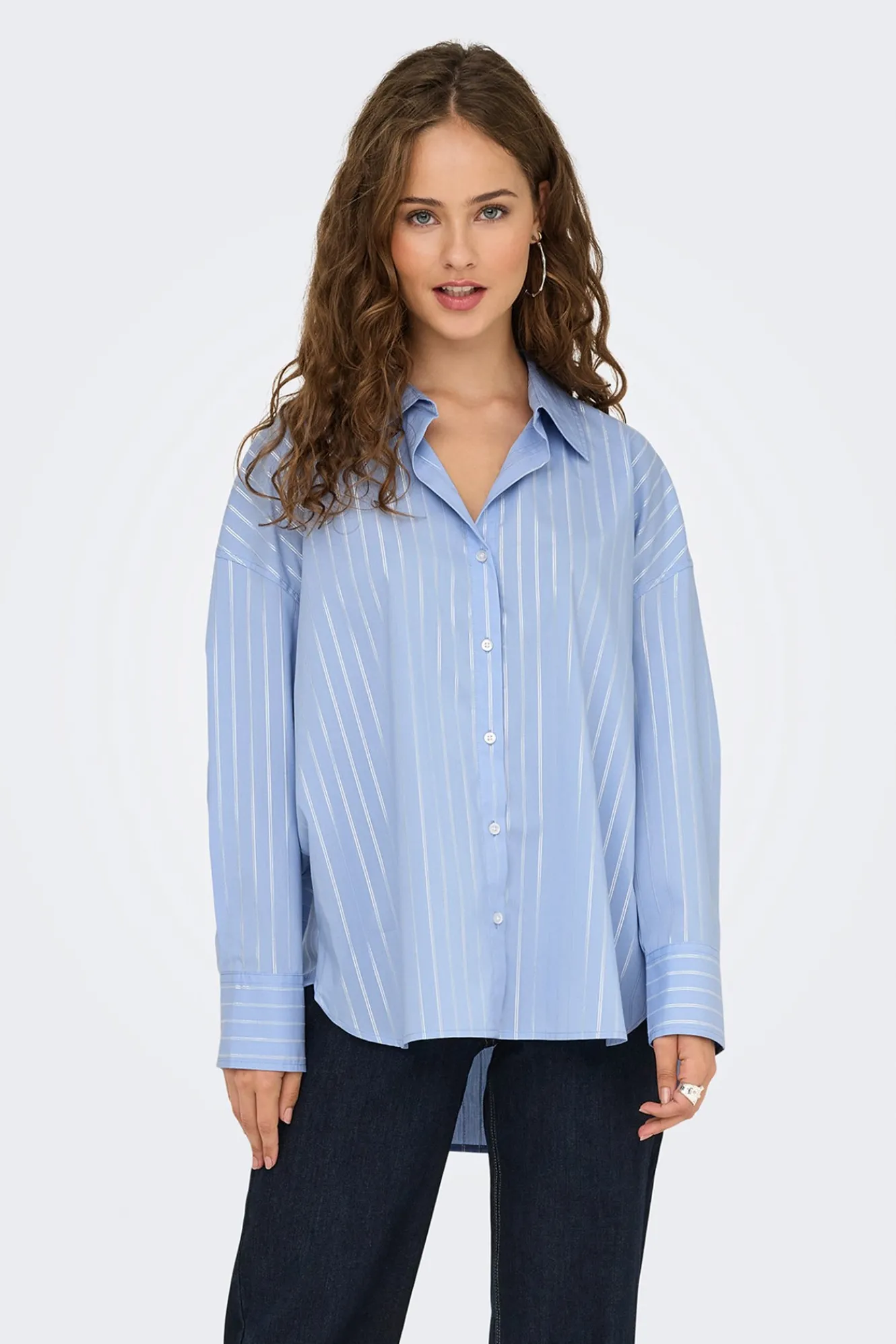– Corte oversize, cuello clásico, puños ajustados y cierre de botones delantero.