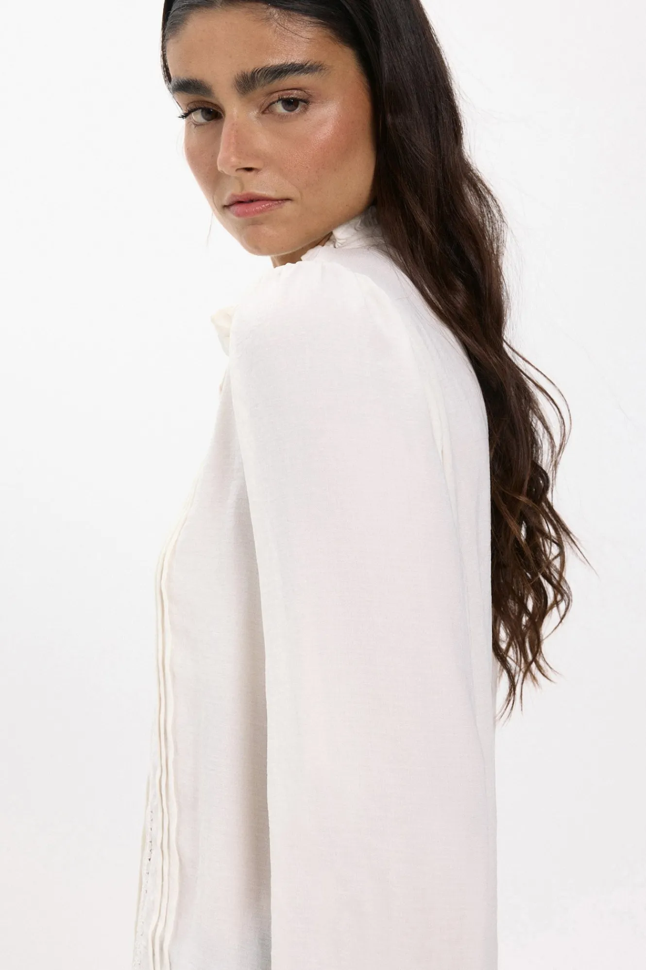 – Corte recto, cuello perkins con volante fruncido, manga larga ligeramente abullonada, cierre de botones delantero y detalles de encaje.