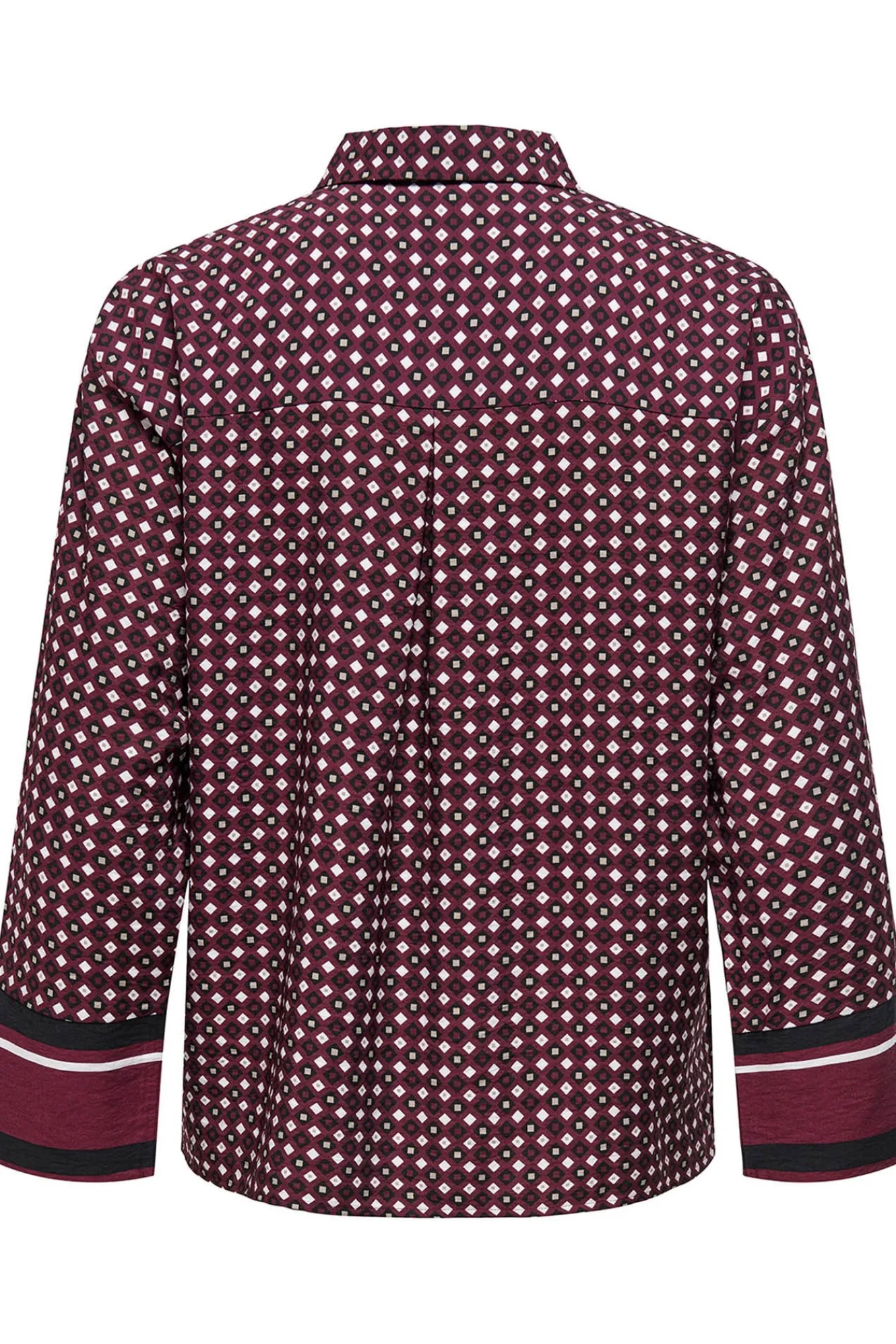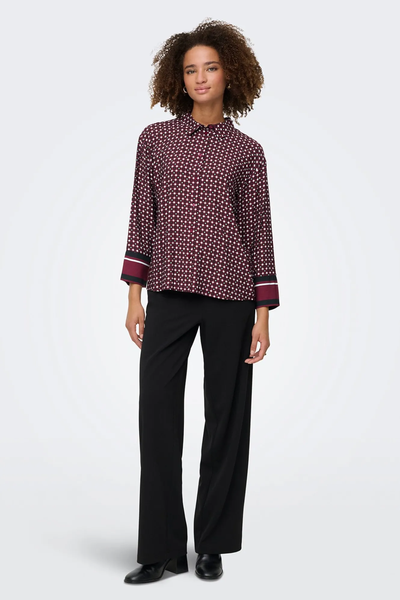 – Corte holgado, cuello clásico, manga larga amplica, cierre de botones frontal y estampado geométrico.