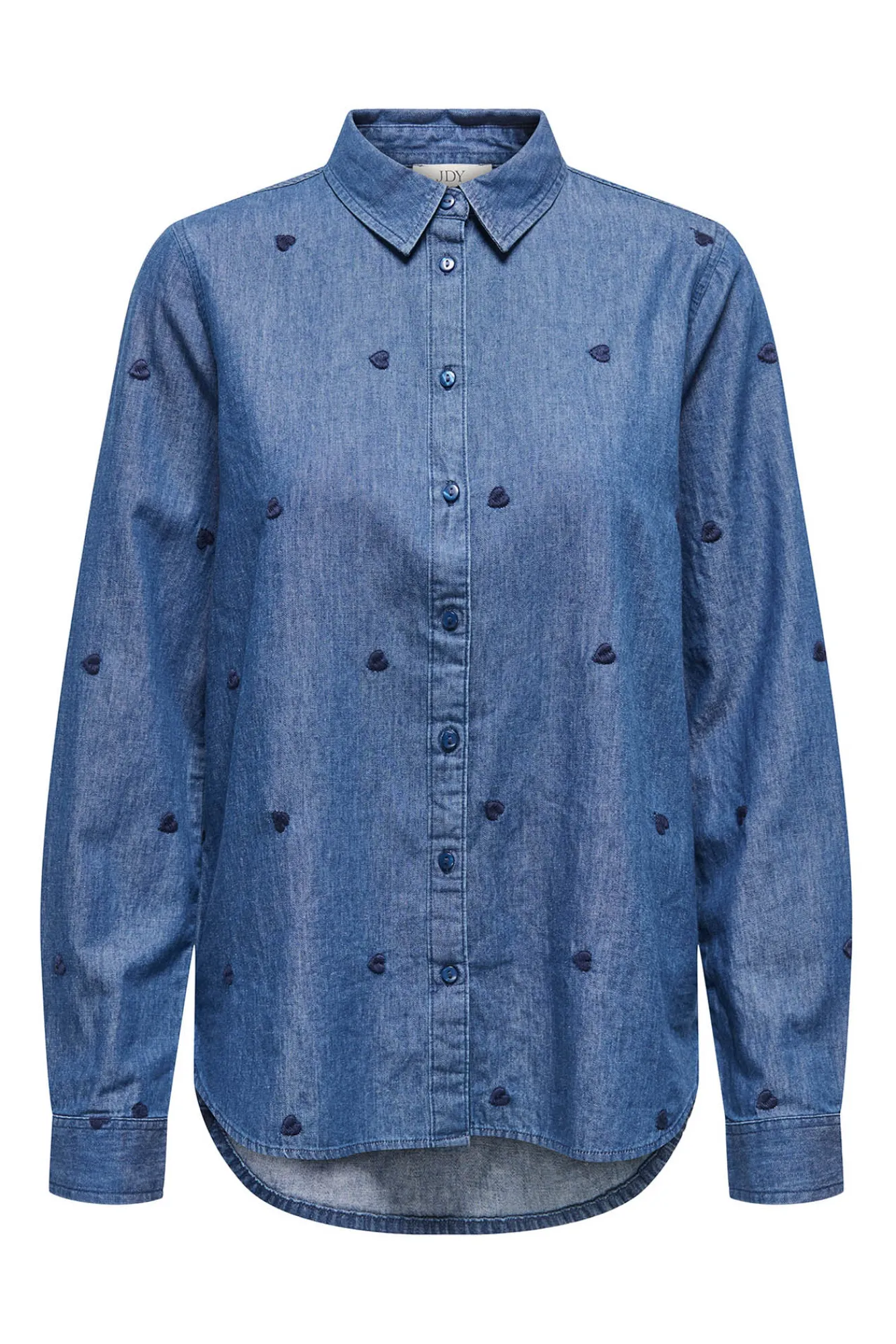 – Corte holgado, cuello clásico, manga larga, bajo asimétrico, cierre de botones delantero y corazones bordados.