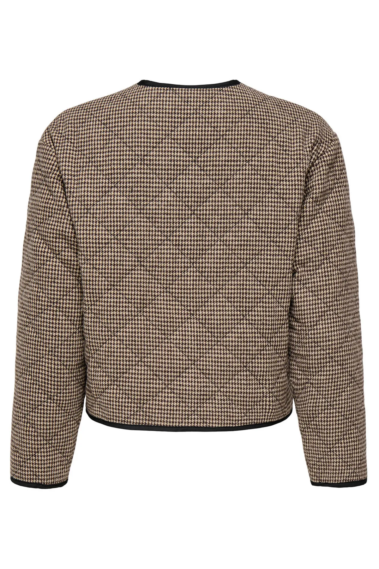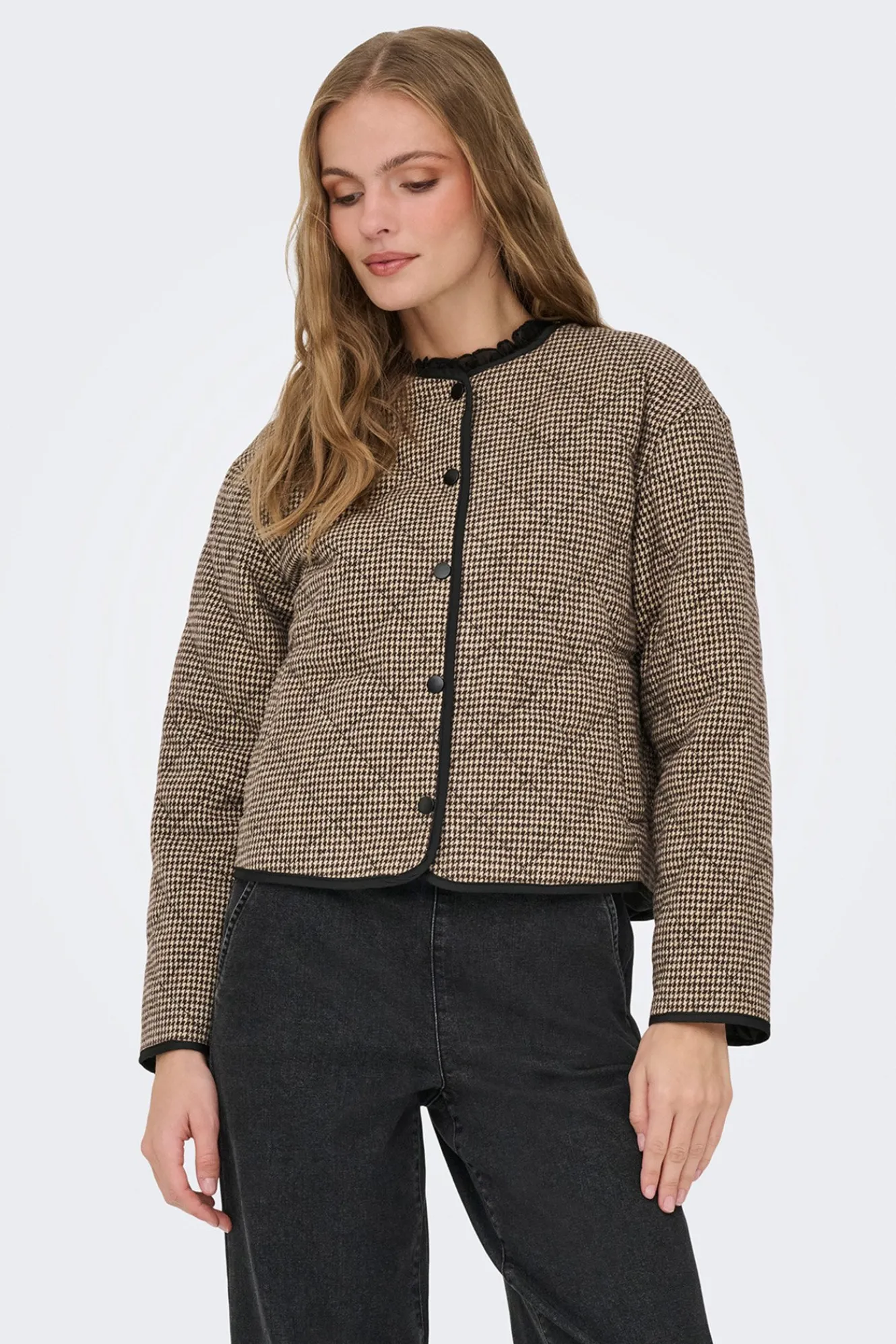 – Corte recto, manga larga, cuello redondo, bordeado en ribete a contraste, cierre de botones frontal y microestampado de cuadros.