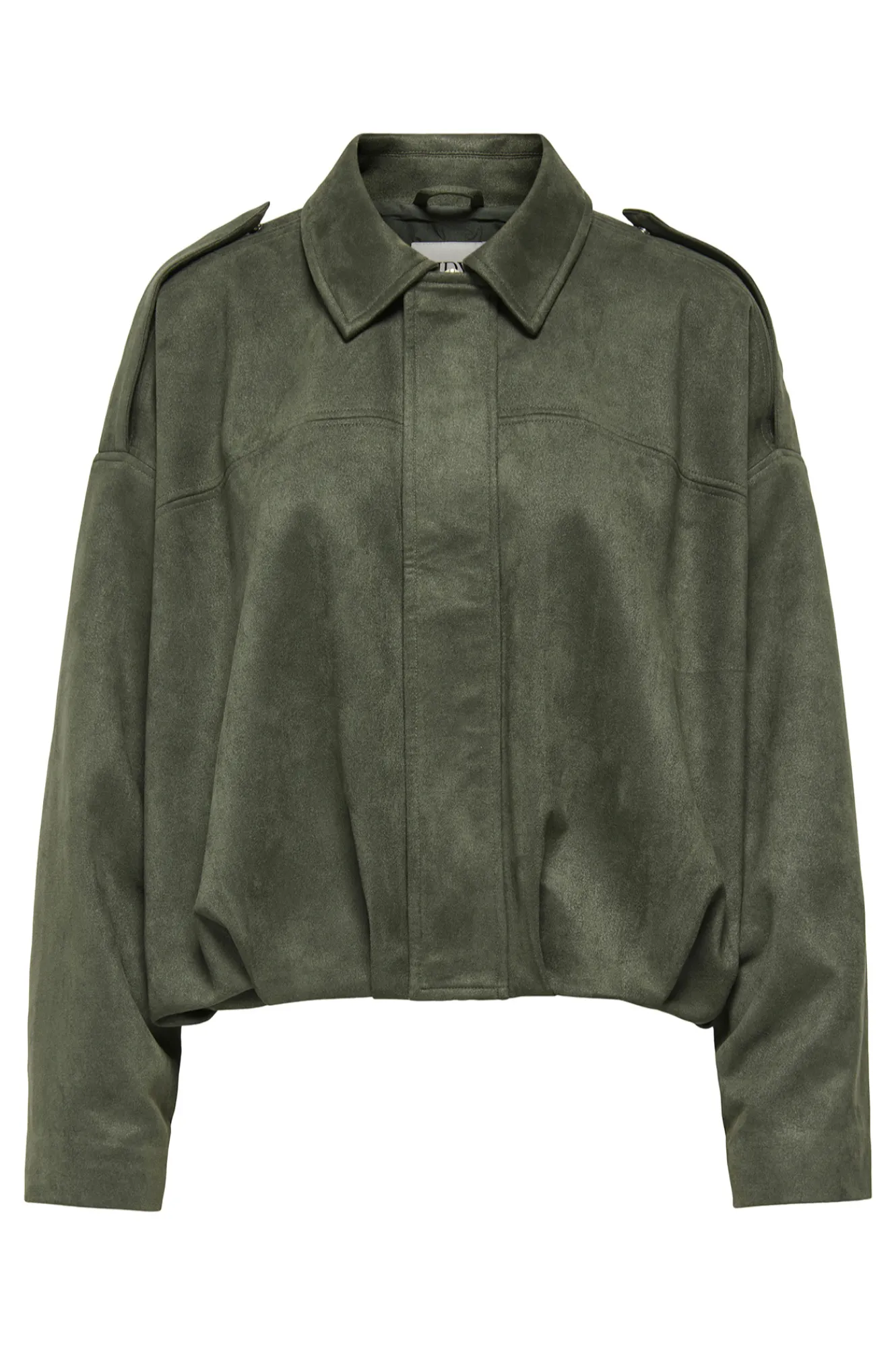 – Corte amplio, cuello solapa, manga larga con trabilla en hombro, bajo acabado con pliegues y volumen y cierre frontal de botones a presión y cremallera ocultos con solapa.