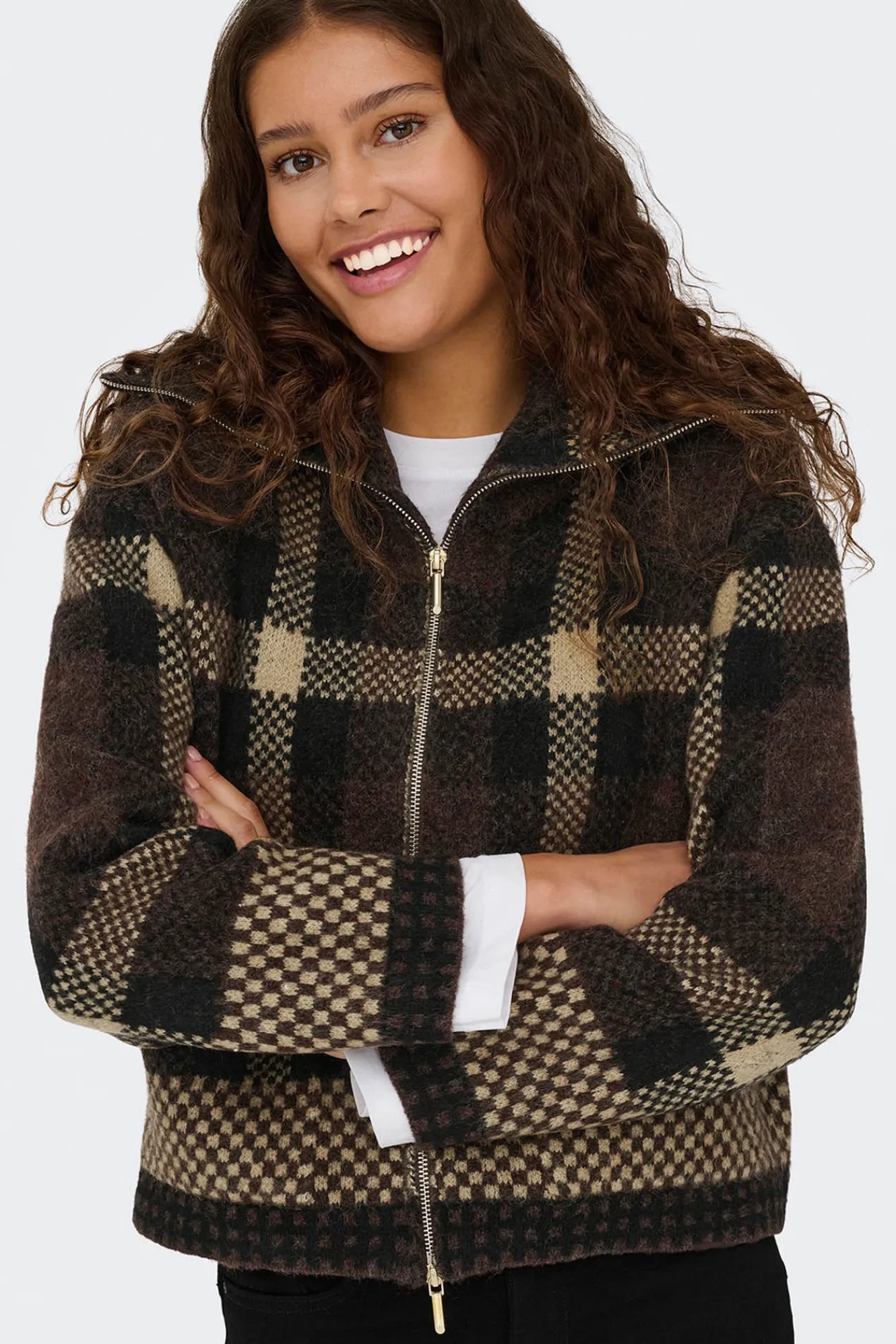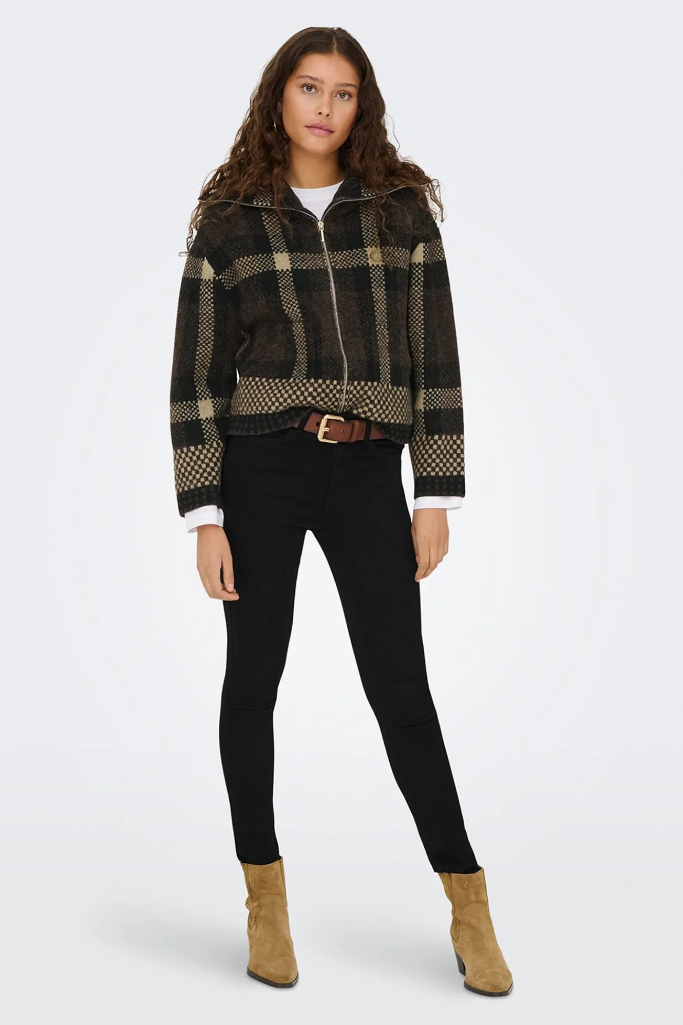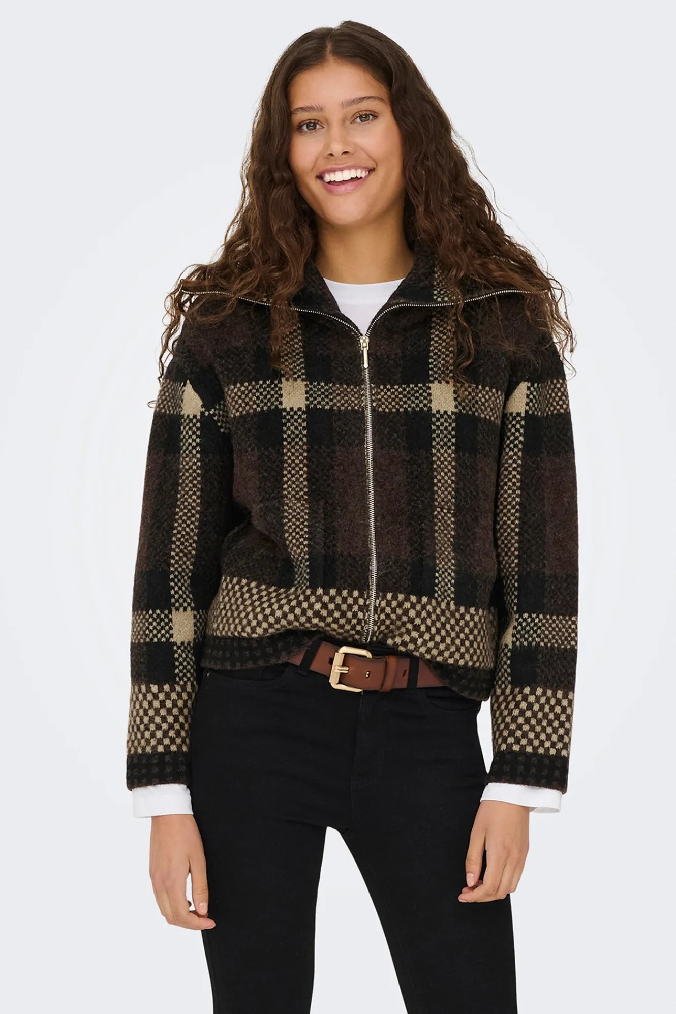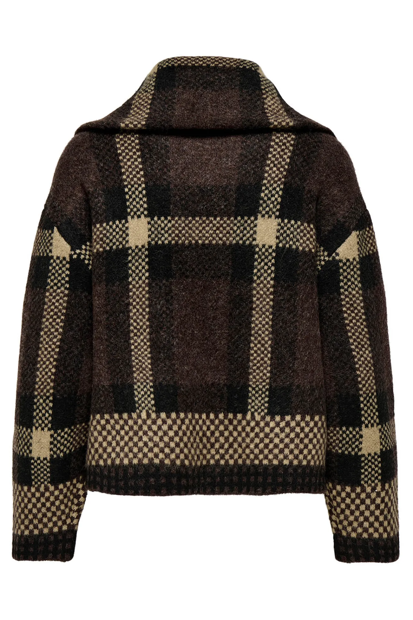 – Corte recto, cuello alto, manga larga, cierre de cremallera metálica frontal en doble dirección, bolsillos frontales y estampado de cuadros.