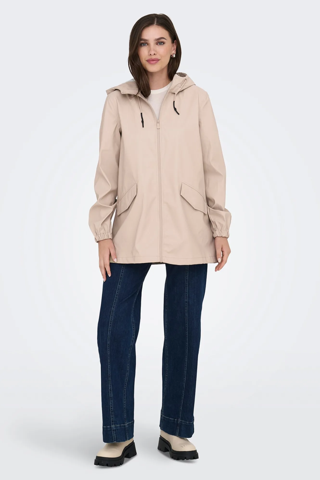 – Corte recto, capucha con cordón ajustable, puños y bajo elásticos, cierre de cremallera frontal y bolsillos laterales con solapas y botón a presión.