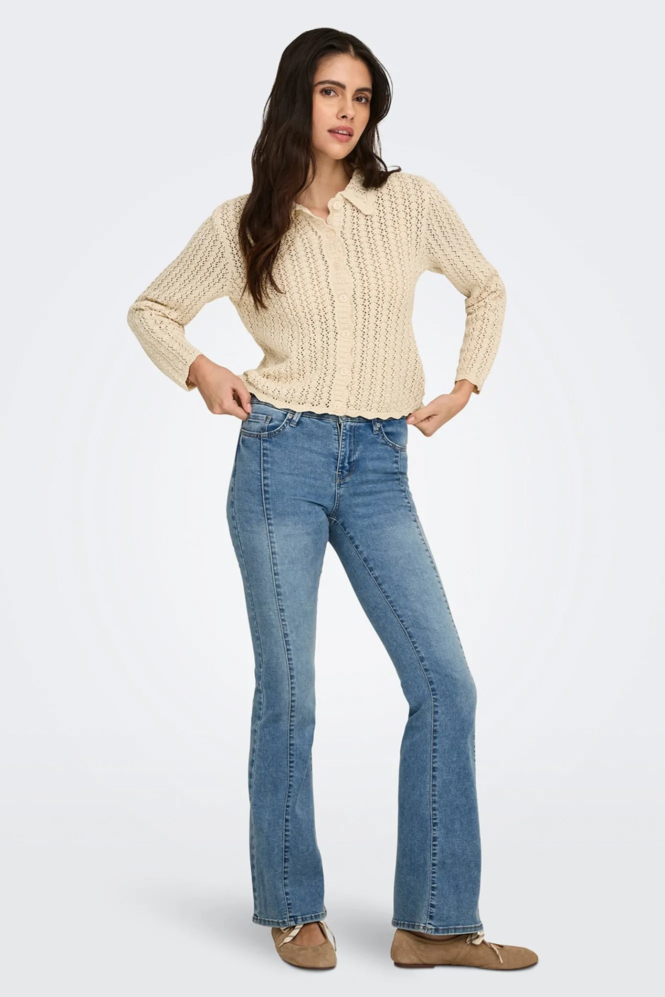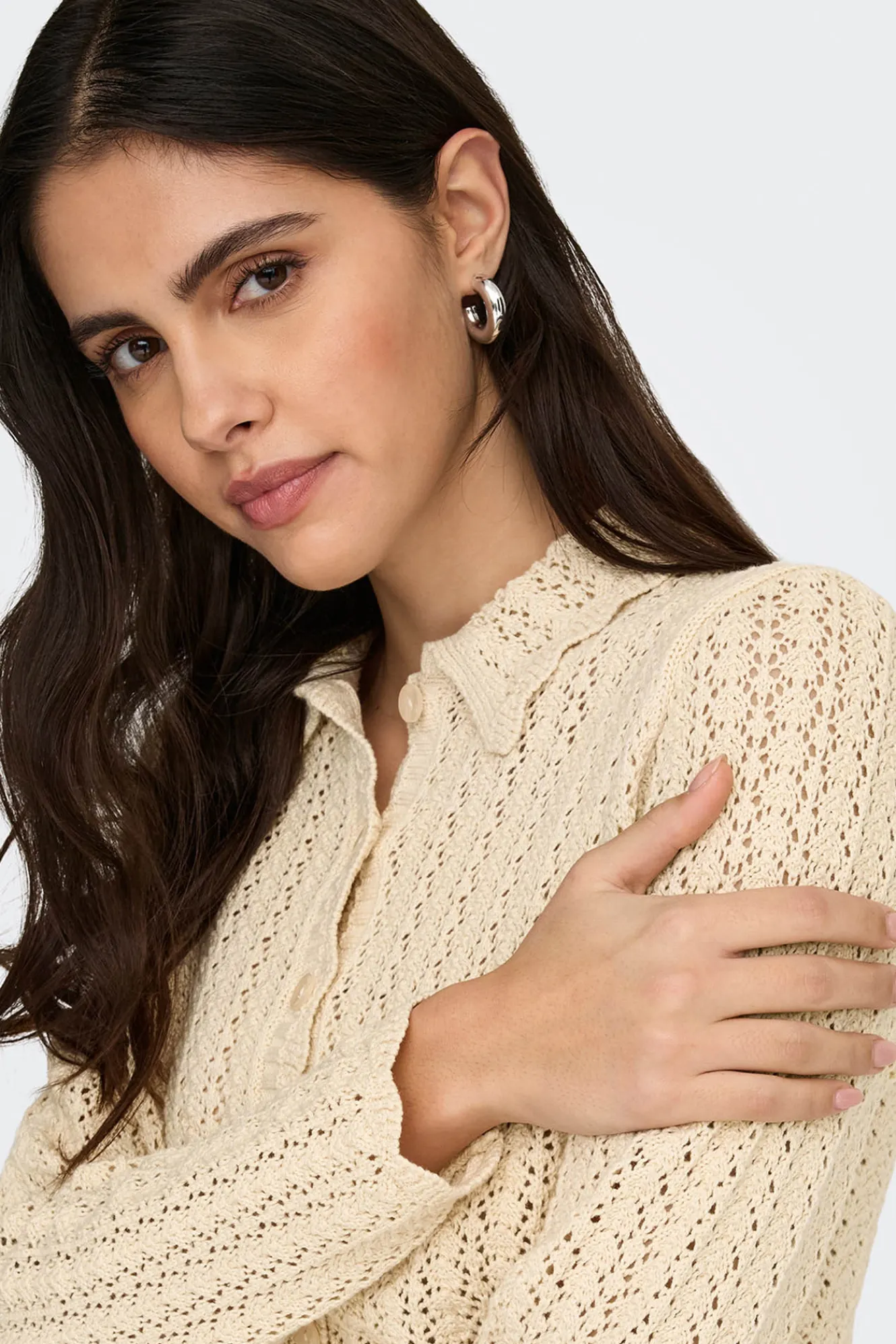 – Corte recto, manga larga, cuello clásico y cierre de botones delantero.