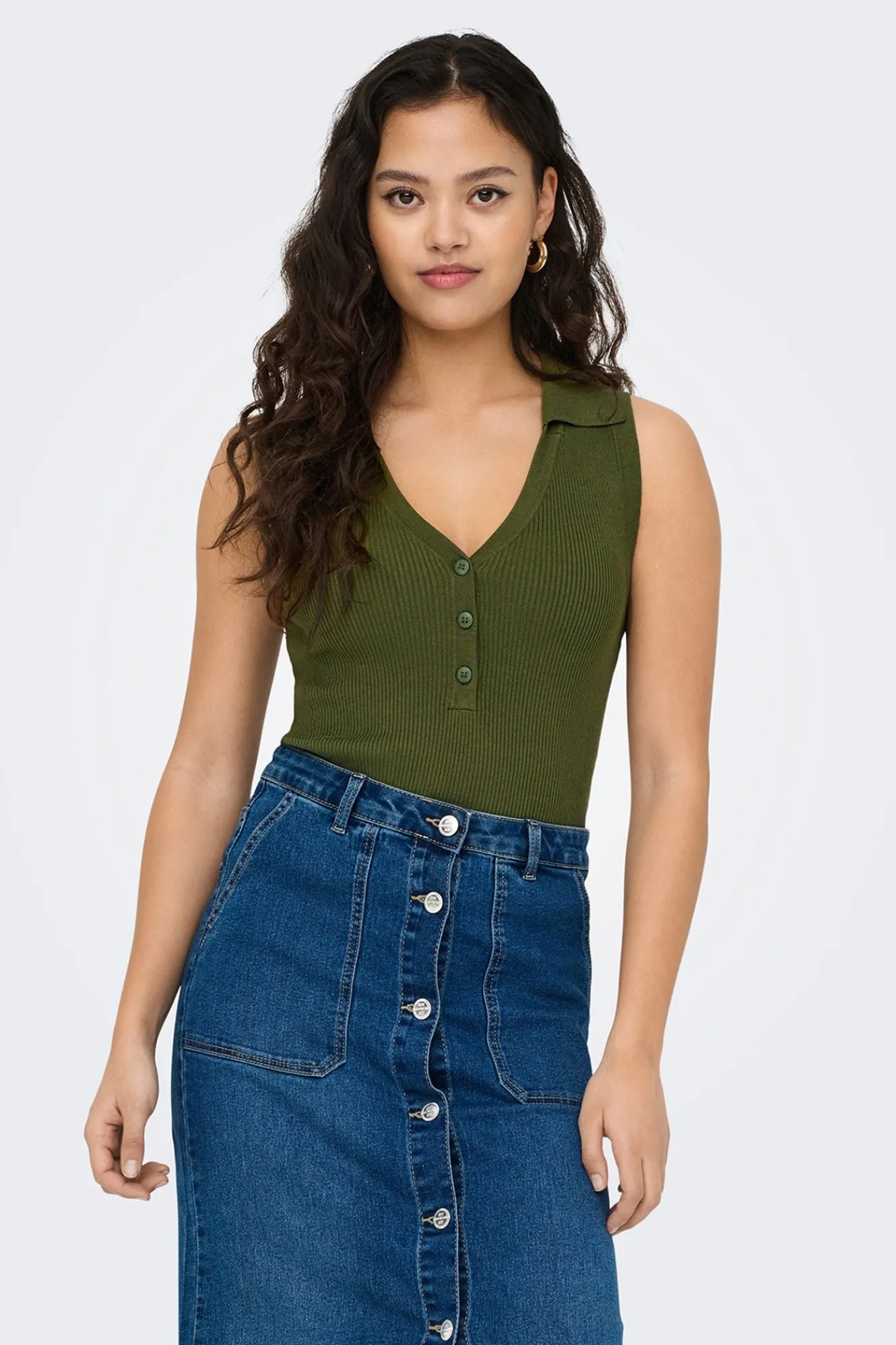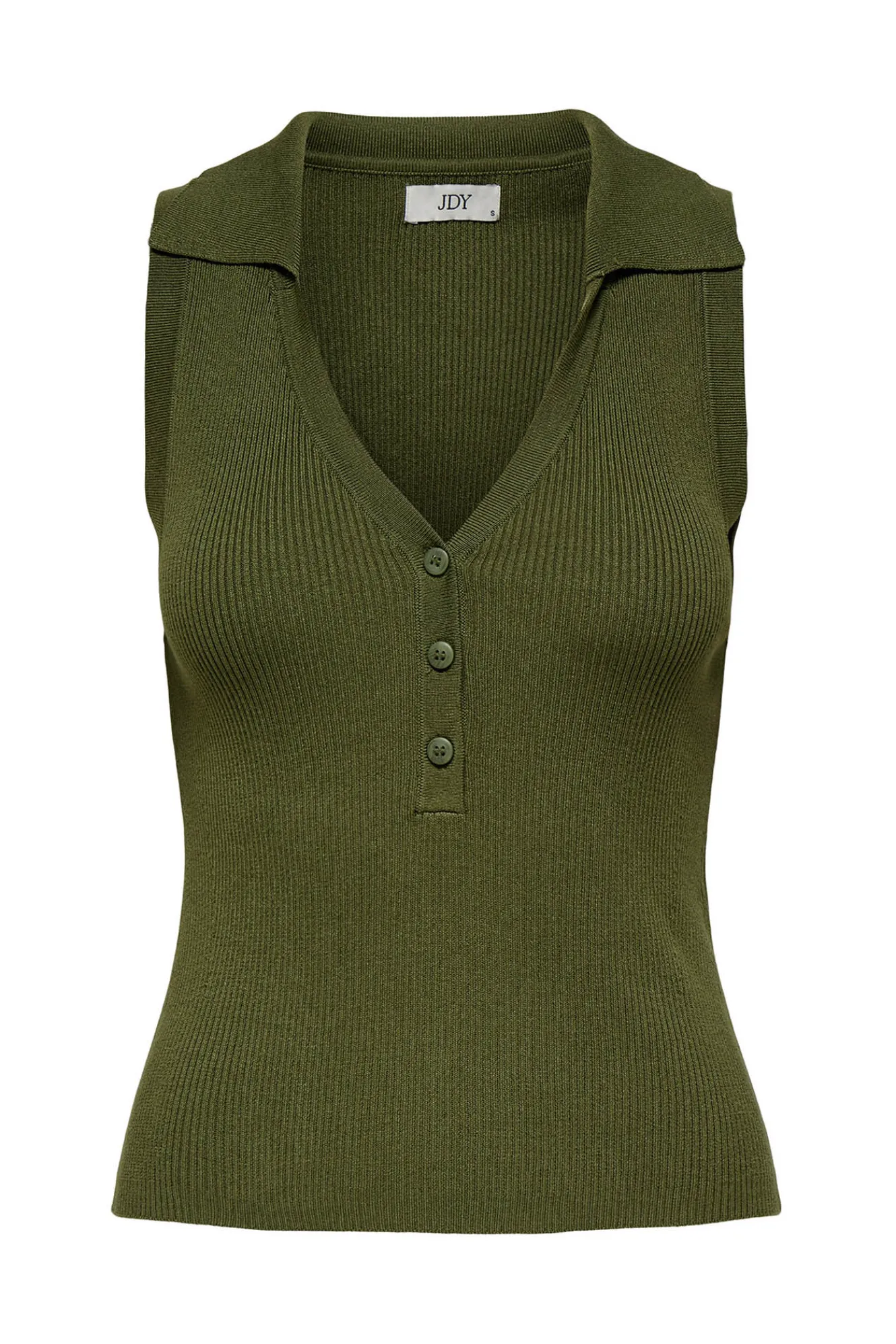 – Corte ajustado, cuello polo con pico y botones delanteros.