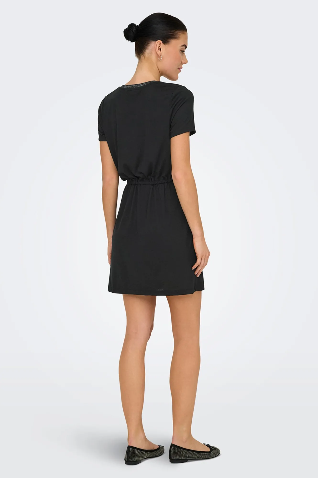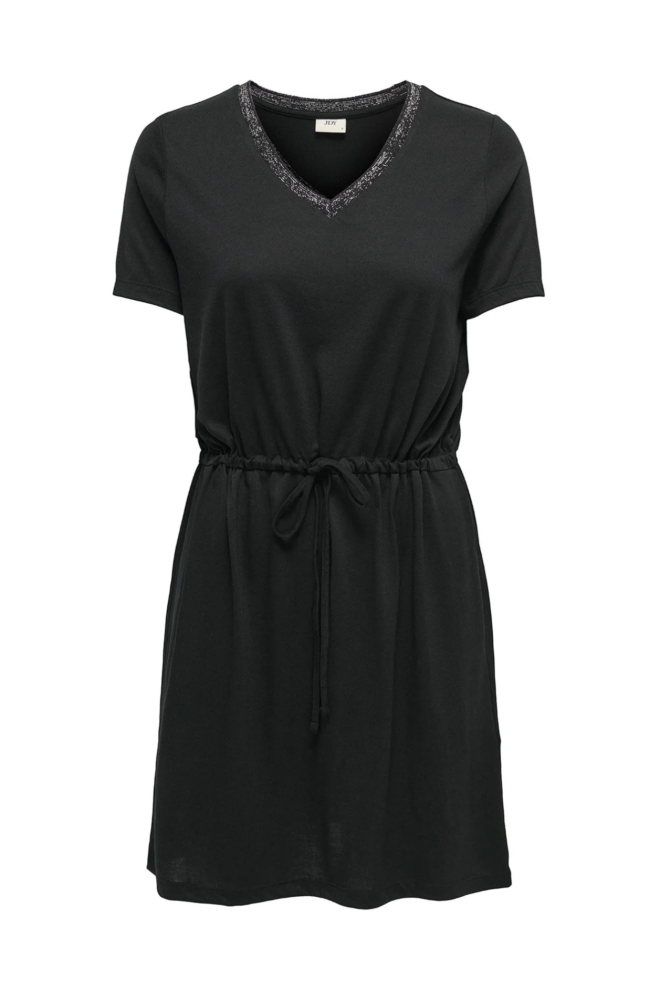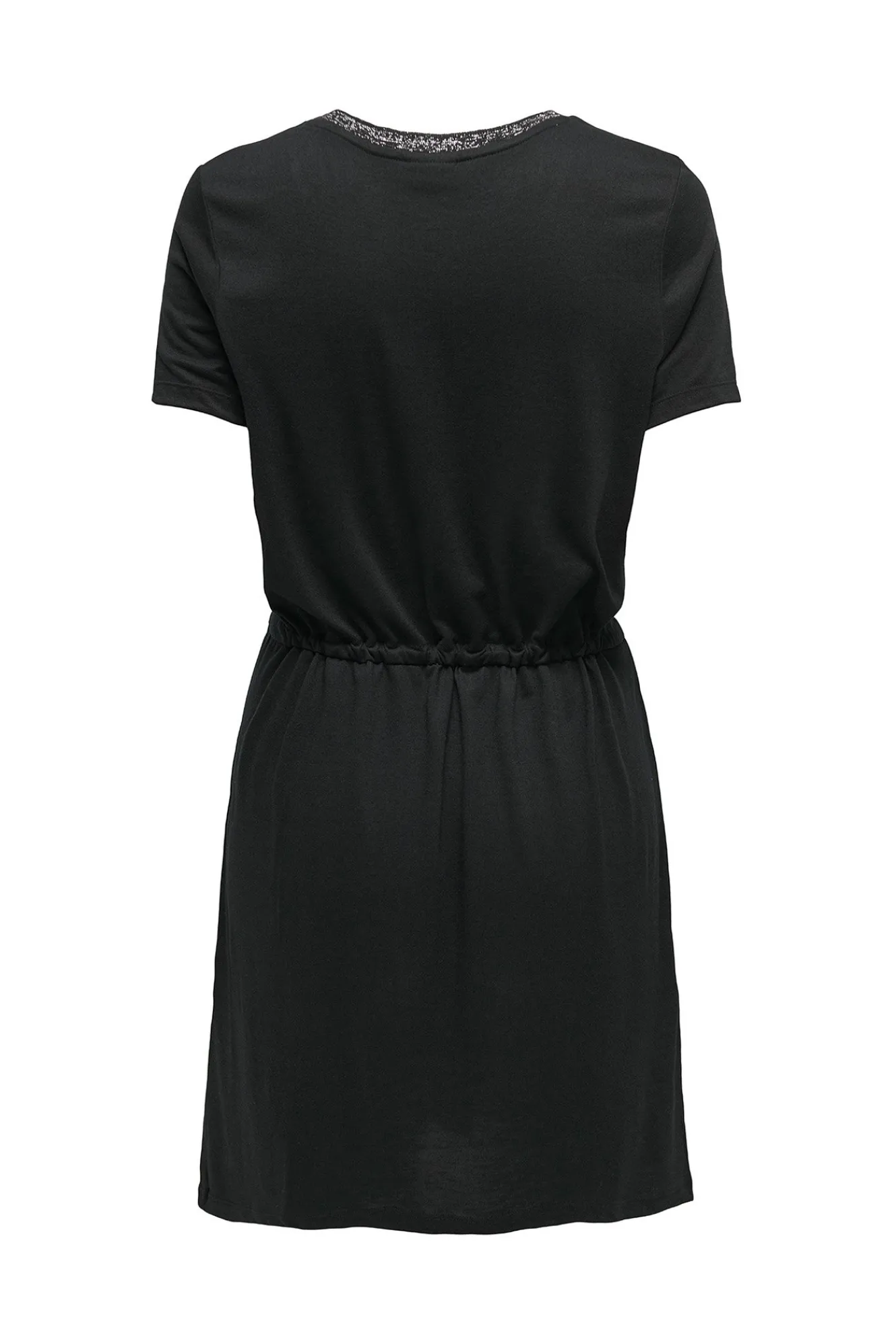– Corte recto, cuello pico con detalle lurex, manga corta y cintura ajustable con cordón.