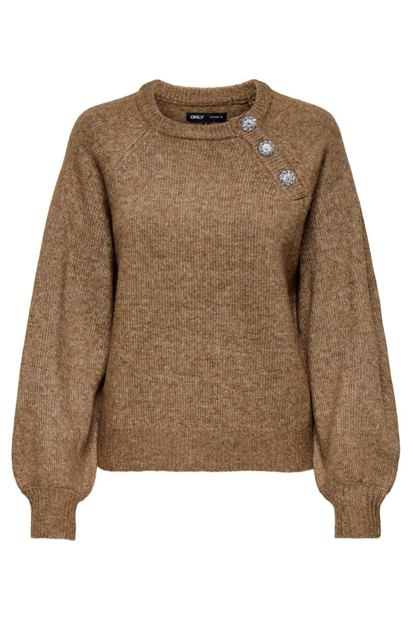 – Cuello redondo con detalles de botones joya en un lateral.