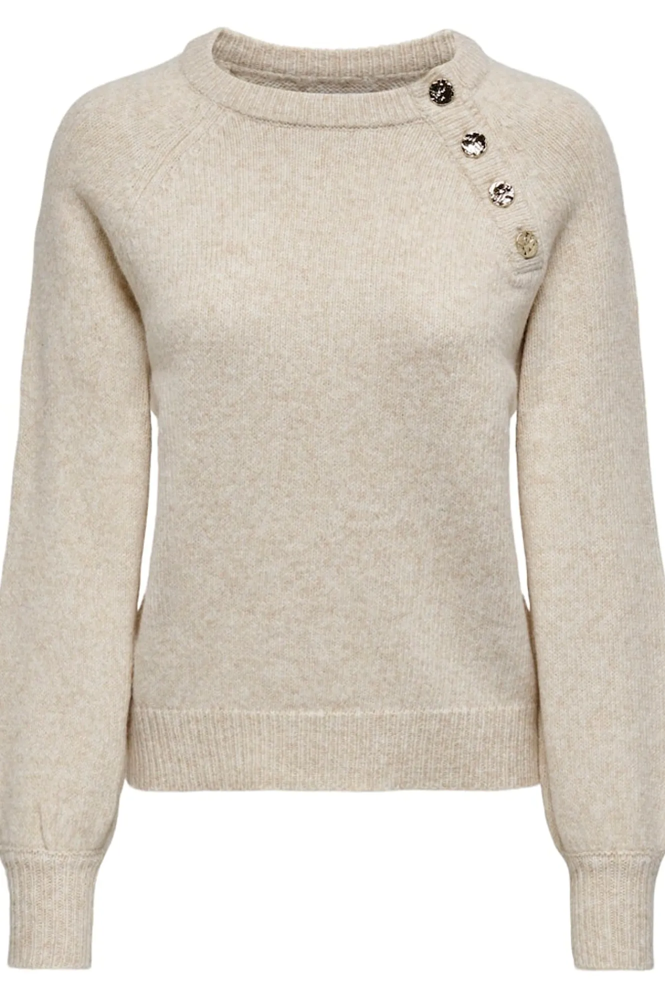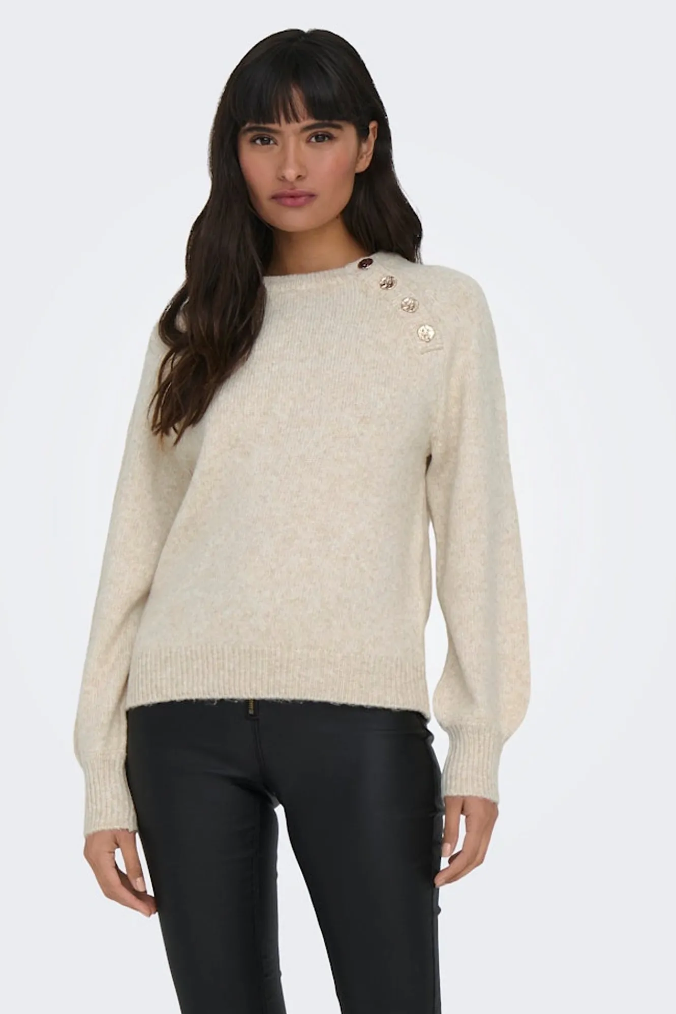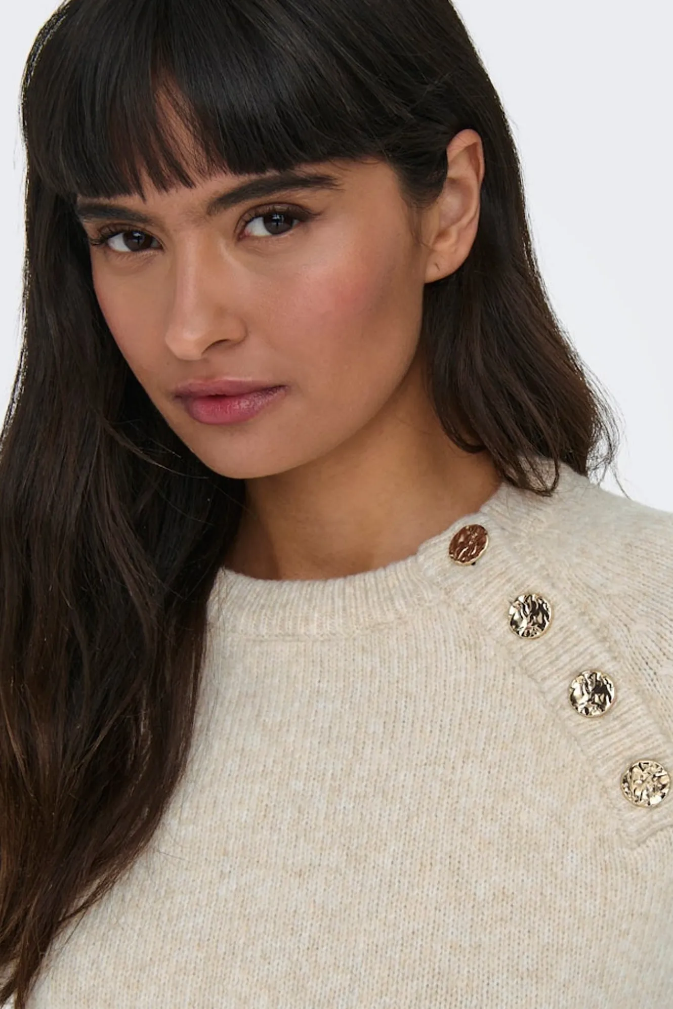 – Cuello redondo con detalles de botones dorados en un lateral.