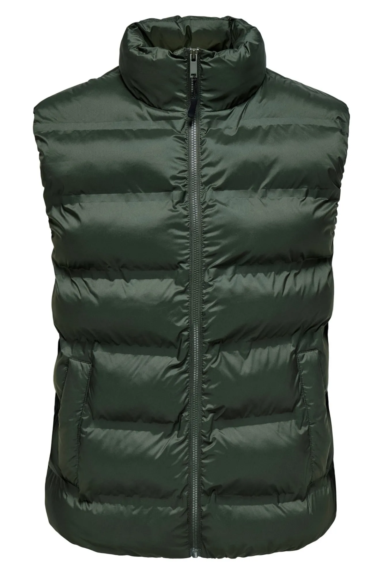 – Corte recto, cuello alto, cierre de cremallera frontal y bolsillos laterales.