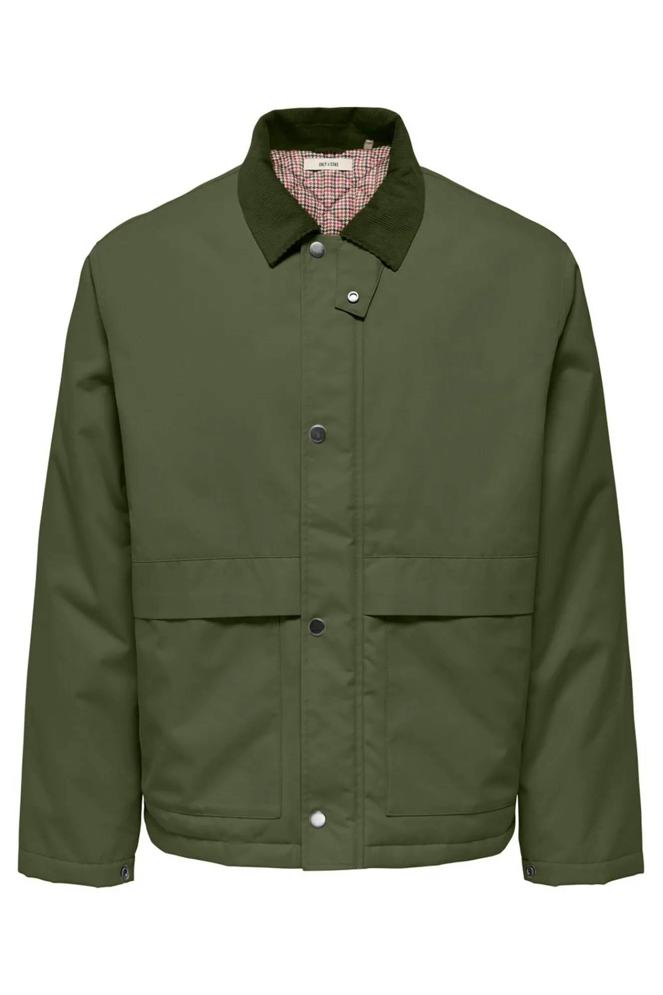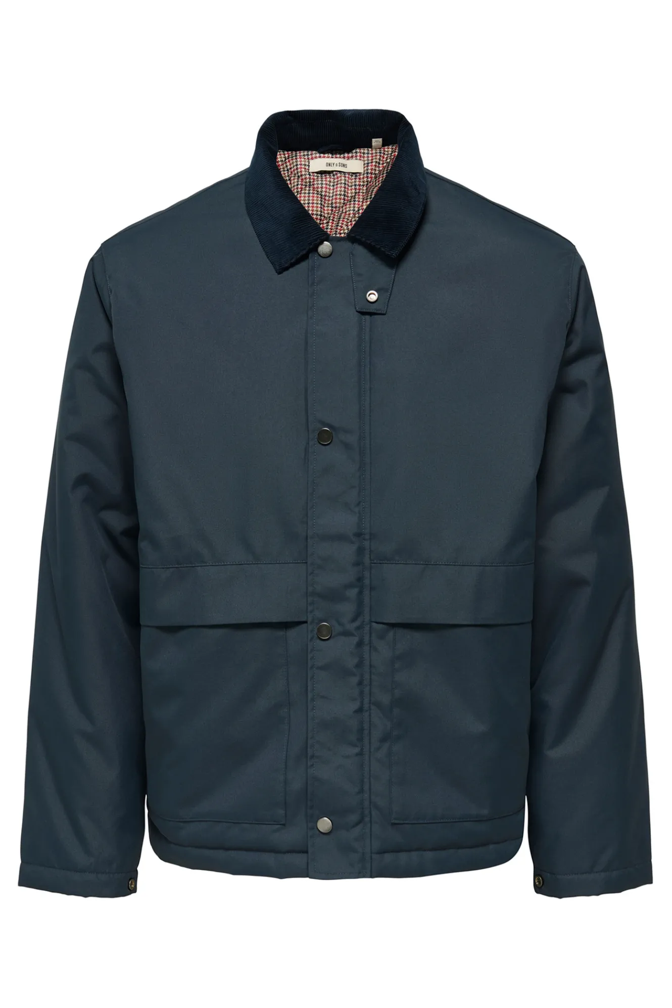 – Corte recto, cuello cásico, cierre de cremallera con solapa con botones a presión, bolsillos frontales con solapa y forro interior visible con estampado de cuadros.